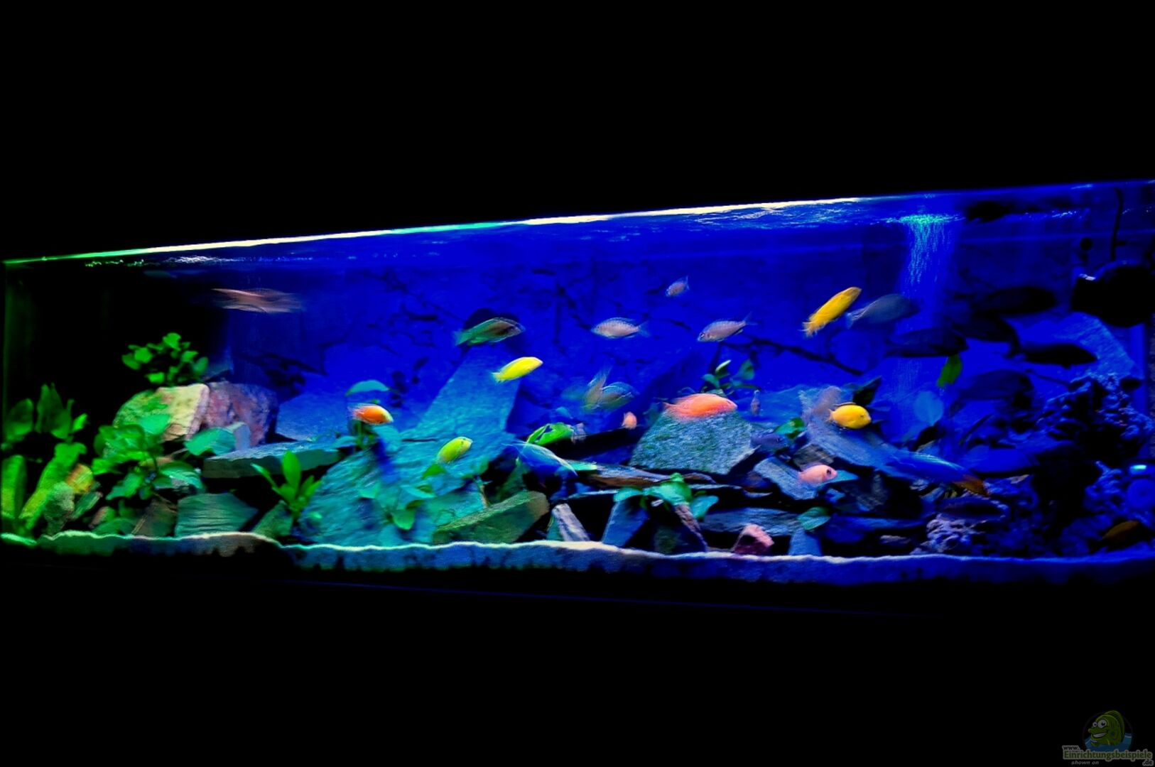 Beleuchtung : 2 T8 Röhren, die vordere Röhre ist eine Aqua-Glo der Firma Hagen.Die hintere Röhre ebenfalls.Beide Röhren sind mit Alufolie abgedunkelt und zum Teil mit blauer und grüner Folie umwickelt.Beide Röhren haben 36 watt. Aquarium: 12mm Sicherheitsverglasung sowie Verklebung. Bodenbereich 2 Bohrungen für Pumpensystem. Bodenplatte habe ich eine 20mm Styrodurplatte eingelegt für den Steinaufbau Da wir gerade ein Haus gekauft haben, wollten wir es dem Wohnzimmer anpassen. Wei?? [...]