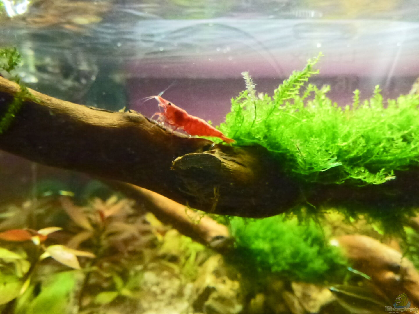 Im Becken befinden sich 2 Drachensteine und 2 Wüstenwurzeln welche mit verschiedenen Moosen bepflanzt wurden. Am Boden liegt noch eine Schieferplatte, welche unbepflanzten Bereich abgrenzen soll. Dieser dient zur Futtergabe für die Garnelen und Schnecken um das nicht verbrauchte Futter besser wieder aus dem Becken zu bekommen.