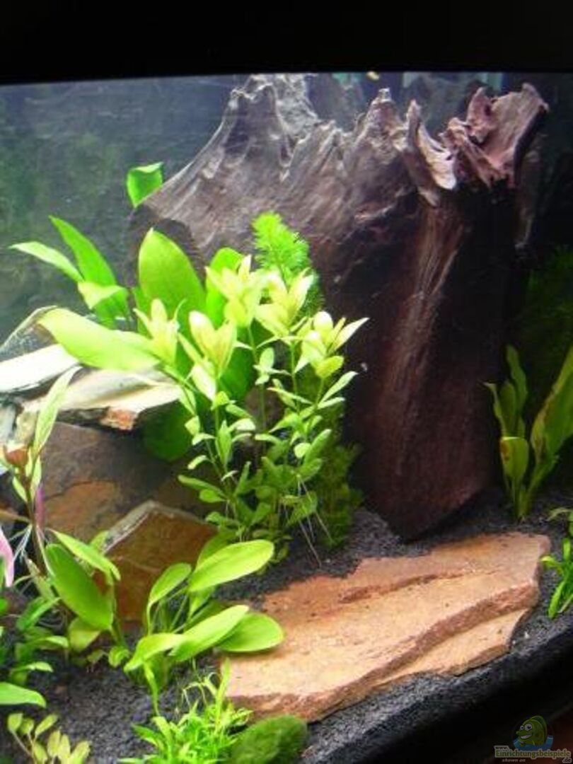 In der linken, hinteren Ecke habe ich eine 2-stufige Terrasse aus Plexiglasplatten gebaut. Eine gro??e Hohle aus einem Ton-Drainagerohr (100 mm Innendurchmesser) ´getarnt´ mit Schieferplatten und eine kleine Höhle aus einem kleinen, halbierten Ton-Blumentopf (ebenfalls mit Schieferstückchen beklebt). Rechts gibt es eine gro??e Wurzel und davor eine glatte Quarzit-Platte