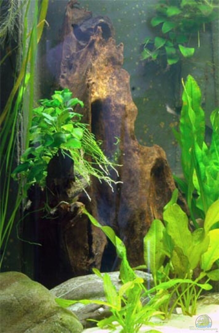 Die Rückwand habe ich aus Dachdeckerschiefer selbst gebaut. Ich wollte eine natürliche Rückwand, die nicht zuviel Schwimmraum wegnimmt. Die Schieferplatten sind ideal, da sie nur 4 - 7 mm in den Beckenraum ragen. Die Bearbeitung mit dem Dachdeckerwerkzeug lernt sich relativ schnell; ich habe 10 Platten verarbeitet und keine zerstört im Sinne von zerbrochen. Die Platten wurden mit A.-Silikon im Becken befestigt. Aus dem Verschnitt (Streifen von 35 mm Breite) habe ich die ´Anubias-Halter´ [...]