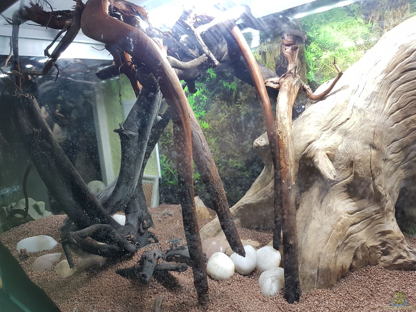 Eine Dicke Wurzel an der Rückwand hingestellt so das sie vom Boden bis zur Wasseroberfläche reicht. Es ist eine Mangrovenwurzel und die haben wir über A....n bezogen und wahren sehr überrascht von der Schönheit dieser Wurzel. 3 x15-20 cm Moorkienwurzel Moorkienholz mit 2 Garnelenbäumchen Wurzel. Auch bestellt und es sind auch schöne Wurzeln. 2 Kokosnuss schalen als Unterschlupf. Ein Paar kiesel.