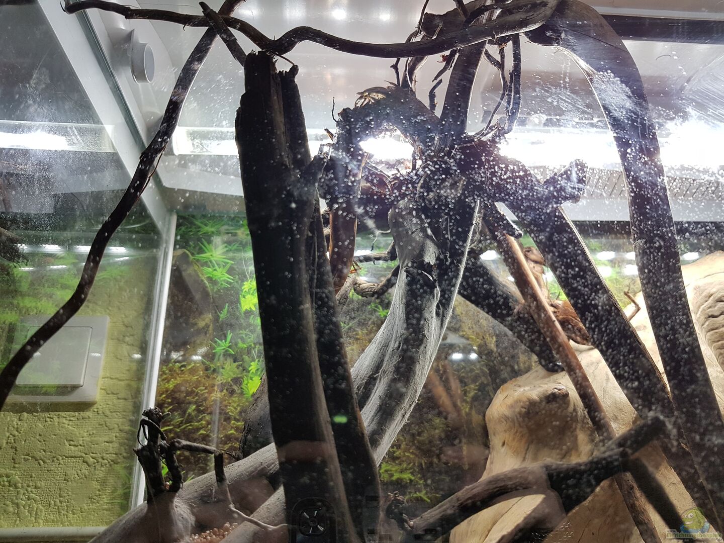 Eine Dicke Wurzel an der Rückwand hingestellt so das sie vom Boden bis zur Wasseroberfläche reicht. Es ist eine Mangrovenwurzel und die haben wir über A....n bezogen und wahren sehr überrascht von der Schönheit dieser Wurzel. 3 x15-20 cm Moorkienwurzel Moorkienholz mit 2 Garnelenbäumchen Wurzel. Auch bestellt und es sind auch schöne Wurzeln. 2 Kokosnuss schalen als Unterschlupf. Ein Paar kiesel.
