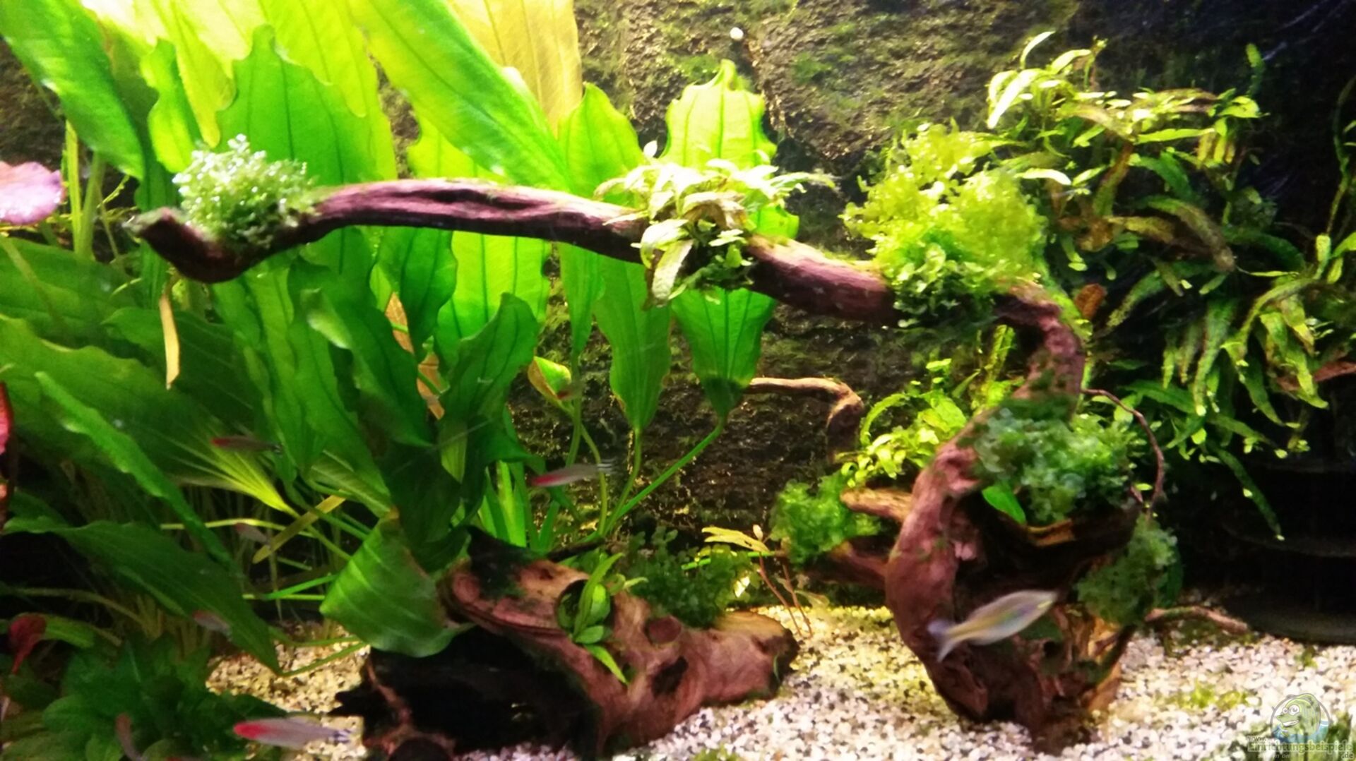 Im vorderen Drittel ist über die ganze Länge eine 9 cm hohe Terrasse eingeklebt. An der hinteren Scheibe ist eine 3D Profil / Strukturrückwand in Stein bzw. Felsoptik eingeklebt. Eine mit Javafarn und Sü??wassertang bepflanzte Wurzel ist im rechten Drittel bis zur Mitte eingesetzt. Eine Schieferhöhle mit mehreren Etagen, steht in der rechten Ecke und ist mit Javafarn bepflanzt. Eine Wurzel liegt noch vor der gro??en Amazonas (die war übrig und musste verarbeitet werden)