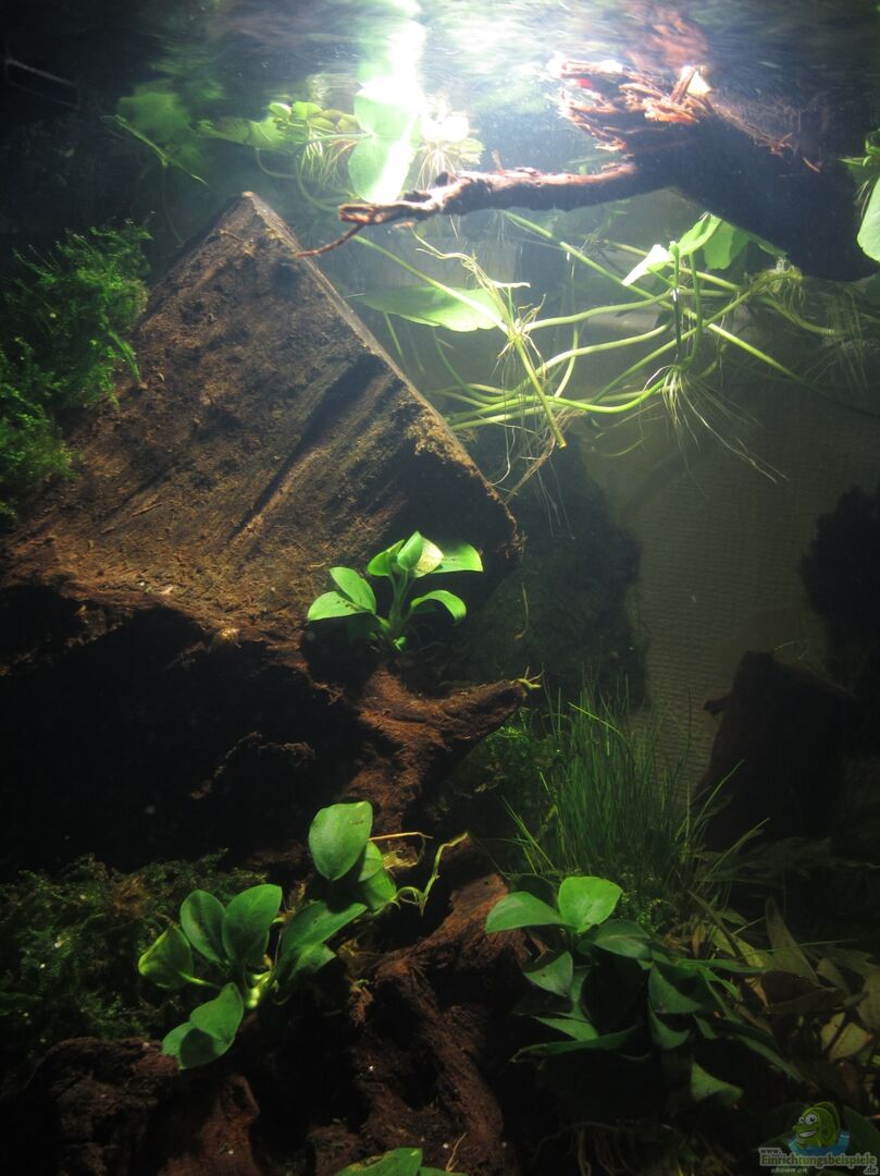 Eingeklebte Terasse aus Plexiglas mit Lavasteinen beklebt. Algenbälle aufgerollt mit Saugnäpfen an der Beckenrückwand befestigt. Holz-Seitenteile, gebeizt als Sichtblende Mangrovenholz an die Rückwand silikoniert und bepflanzt