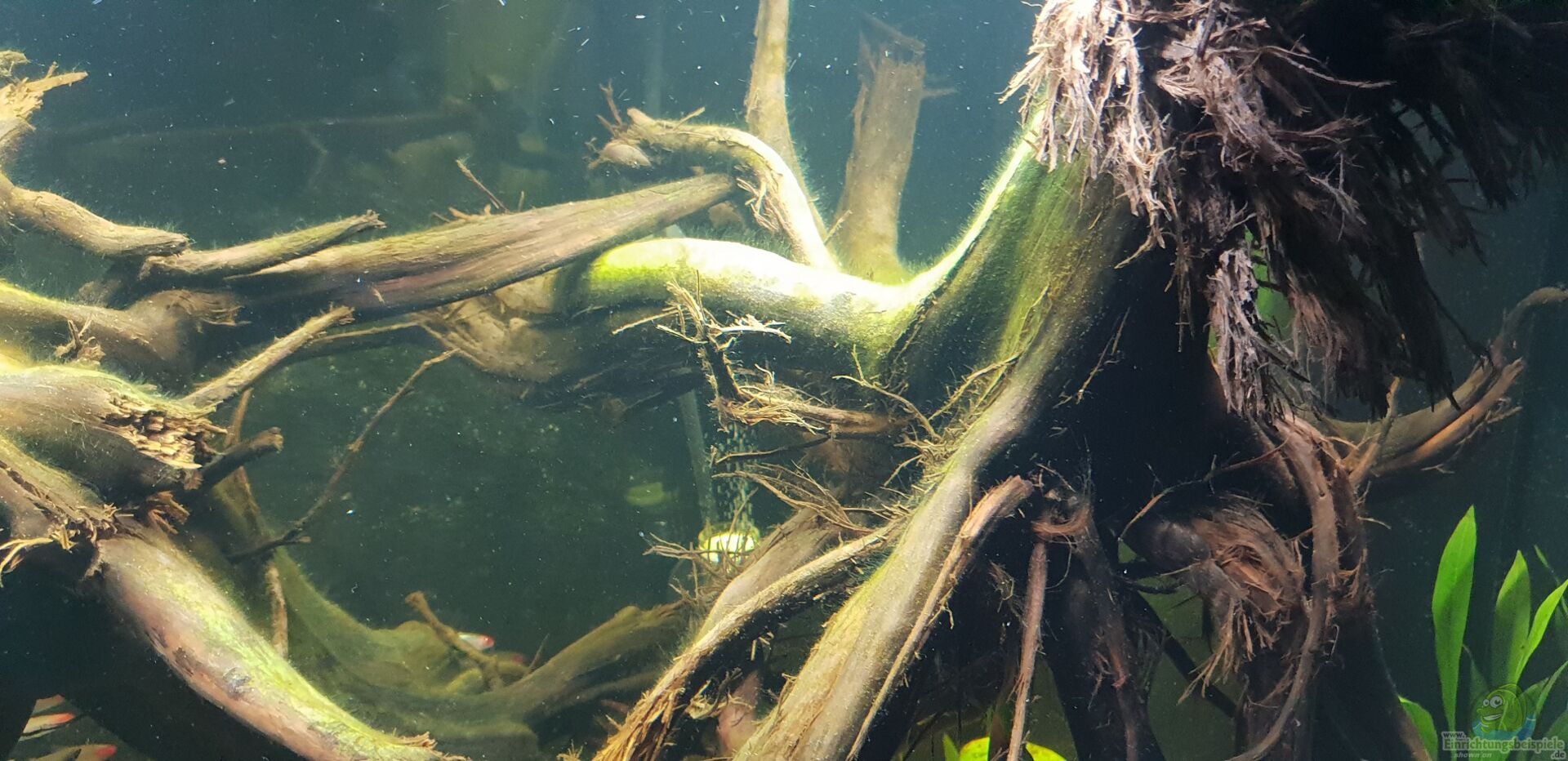 Da habe ich mich für gro??e Moorkienwurzeln entschieden. Schön verzweigt, so wirkt es natürlicher, als würden die Wurzeln der Bäume ins Wasser wachsen. Dazu noch eine JatiWurzel und schwarze Lava, diese dient als Versteck für meine maronis. Anfangs waren die noch schreckhaft, kamen nur selten raus. In der Zwischenzeit haben die sich richtig eingelebt und fühlen sich richtig wohl. Weiteres kam jede Menge Buchen und Eichenlaub dazu. So sieht es noch natürlicher aus, finde ich. [...]
