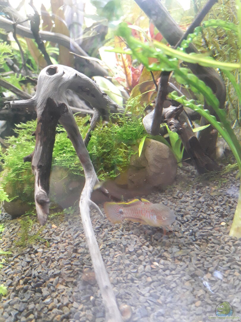 Eine mit Moos bewachsene Welshöhle dient dem Pastelgrundelpäärchen als Liebesnest. Aus selbstgesammelten Schieferplatten habe ich Steinaufbauten und eine Art Stufe eingebaut. Zentraler Hingucker ist eine bepflanzte Taipanwurzel, die an einen umgestürzten Baumstumpf erinnern soll, aus dem neues grünes Leben spriesst.