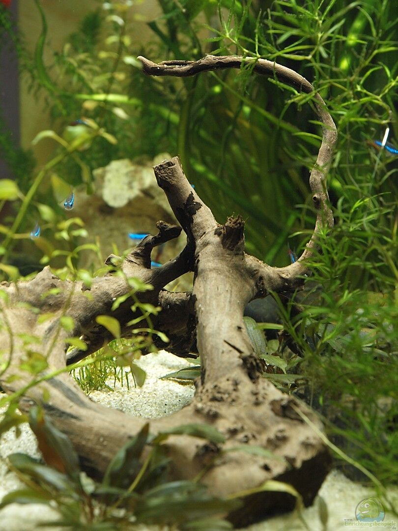 Grösserer, heller Stein, mit kleiner Höhle auf der Rückseite. Unterschlupf aus Lavagestein (vom Ethna mitgebracht). Kleiner Unterschlupf aus Flusssteinen. Kleine gekaufte Welshöhle. Ein paar lose Flusssteine. Mangrovenwurzel. Ein paar Erlenzäpfchen.