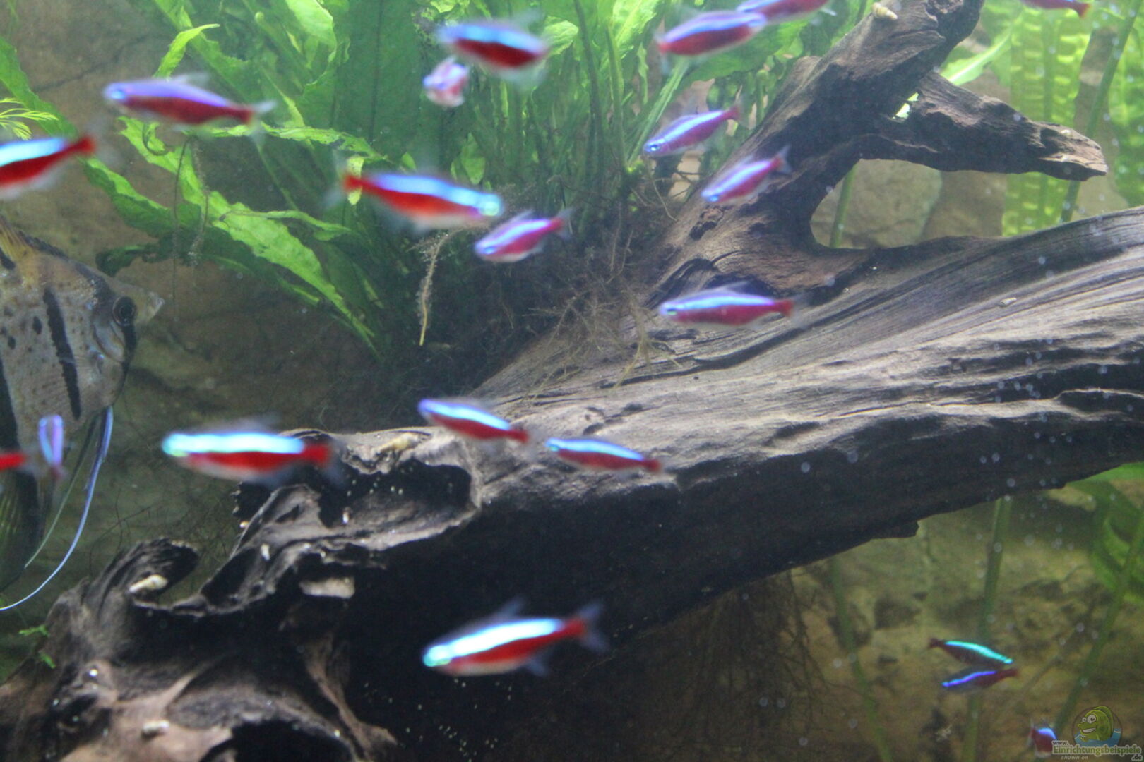 Vier verschieden grosse Morkienwurzeln, versteinerte Wurzeln, zwei Tonröhren, eine Wasserschale aus Kunststoff in Felsoptik(befüllt mit Sand für meine Corys), eine Kokosnusshöhle, eingeklebte Rückwand aus Ton, versteinertes Holz. 15.02.2015 Noch einige Tonröhren hinzugefügt, für die neuen Mitbewohner(3xL333).