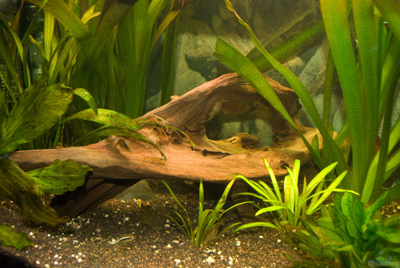 Eine gro??e Wurzel (U-förmig), darunter haben die Prachtschmerlen und Welse reichlich Versteckraum. Kokosnussschale.