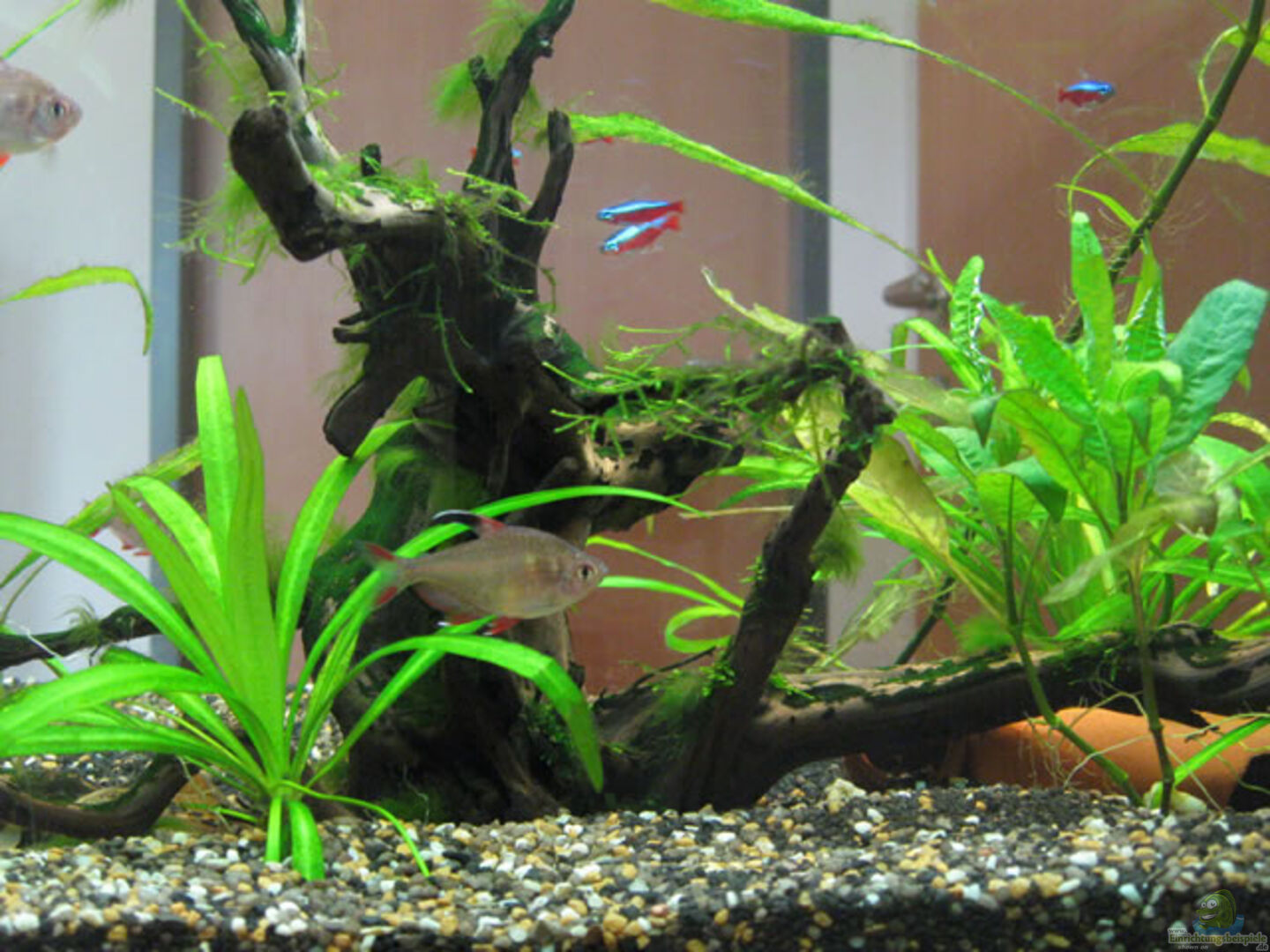 1 x Holzwurzel (Heimat der Zwergkrallenfrösche) 2 x Steine mit Bohrungen 1 x Tonröhre (Laichplatz der Antennenwelse) 1 x Tonkuppel (Laichplatz der Kakadu-Zwergbuntbarsche) 1 x Mini-Tonblumentopf (Rückzugsplatz für die Zwegkrallenfrösche)