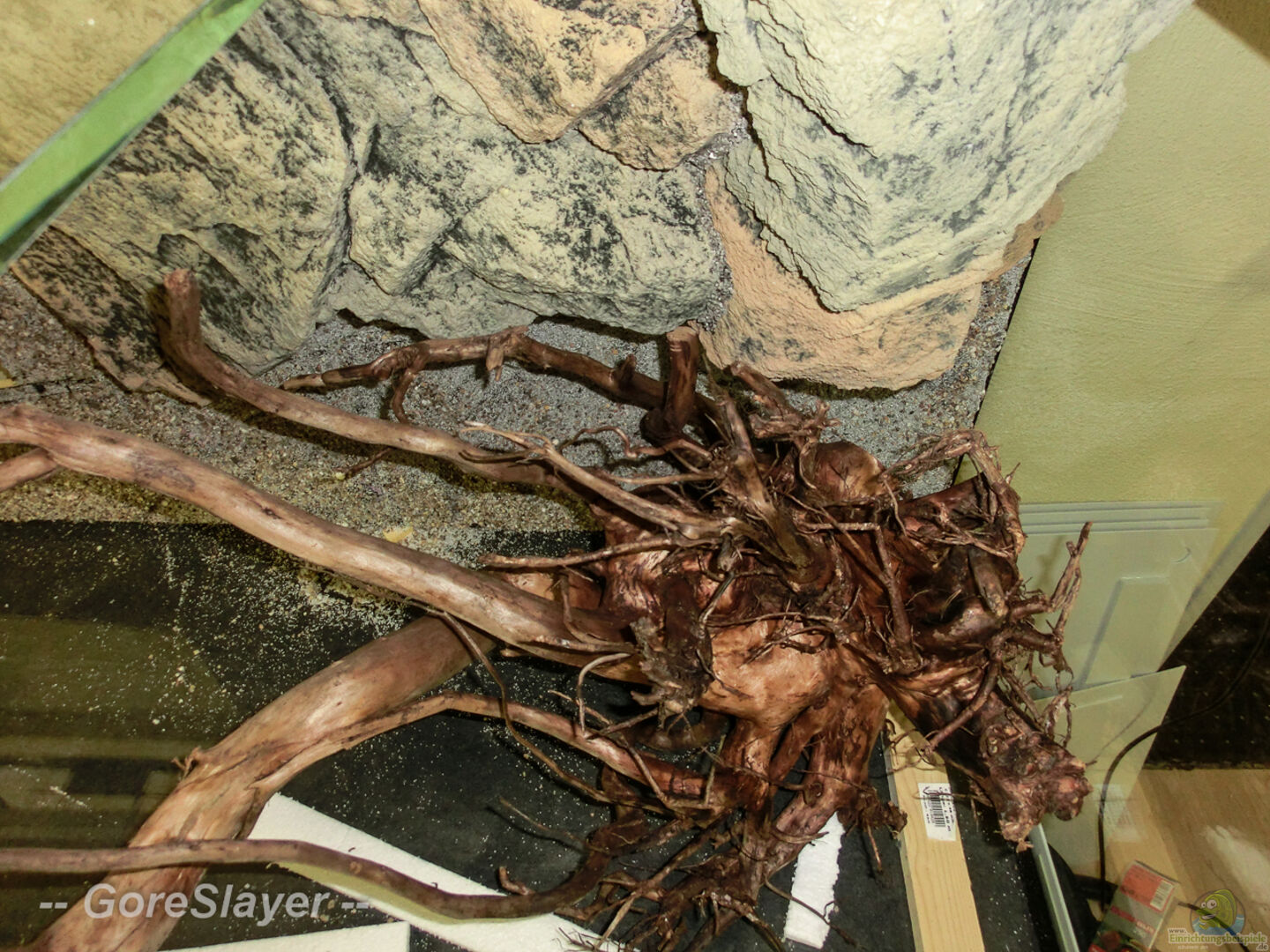 Eine Moorkienwurzel riesig (100x60x60) wurde als Hauptdeko ausgewählt und aus einem deutschem Moor importiert, anschlie??end gereinigt und vorgewässert. Ein weiteres solches Exemplar liefert mir aktuell, die kleineren Abschnitte (3x Moorkienwurzeln klein). 2 der BTN Module sind hinterschwimmbar ausgelegt und wurden innen mit Aquariumsilikon schwarz ausgekleidet, so dass diese als Höhlen später genutzt werden können. Ggf. werden mit Kokosnüssen und weiteren Moorkienwurzeln zusätzliche Verstecke [...]