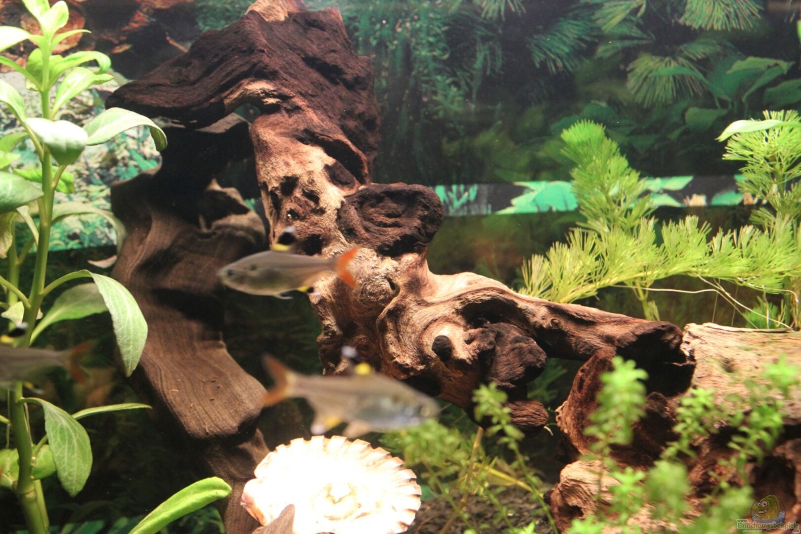 3 verschiedene Hozwurzeln die ein bisschen Struktur in das Aqarium bringen und die Welse zum abraspeln benutzen, ausserdem geben sie Halt für die Garnelen. Die Fadenfische schwimmen auch gern mal hindurch. 3 Muscheln zur Dekoration