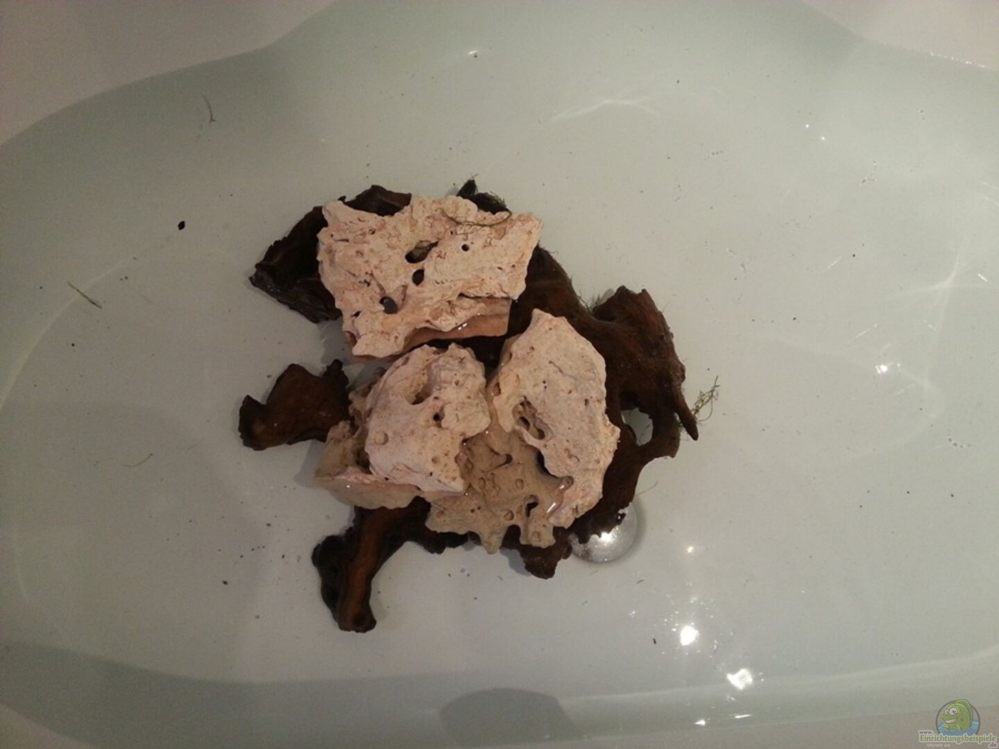 Rückwand selber gebaut mit Höhlen und hinter schwimmbar 2 x Tonröhren 3 x Wurzeln 1 x Lochgestern