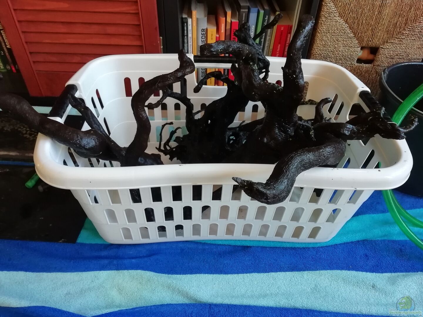 Rückwand / Folie - JUWEL Cliff Dark an der Rückscheibe, sowie die ehemalige Innnefilterverkleidung über Eck an Rück- und Seitenscheibe. - Schwarze Klebefolie von au??en an der rechten Seitenscheibe Aufbau - verschiedene grö??erer Flusskiesel und Flusssteine aus dem Rhein und Neckar, sind geschätzt etwa 25-30kg Steine - 2 Welsröhren Ton als geschlossen Höhlen - Mangrovenwurzeln, Moorkienwurzeln und Spiderwood, es sind 3 einzelne Wurzeln verbaut worden