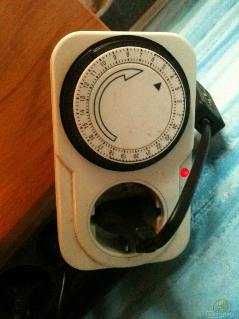 Heizstab von Eheim. Aquarientermometer. Das Licht wird über eine Zeitschaltuhr geregelt. Das Wasser wird mit Kati + Ani (Vollentsalzung) aufbereitet.