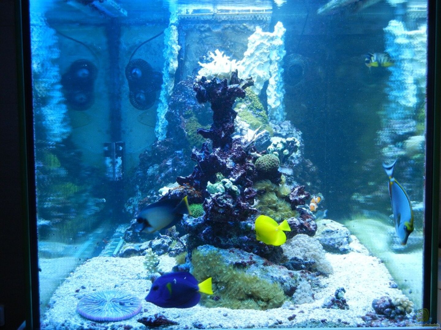 4 Bohrungen mit Ablaufschacht in der Mitte 40er Ablauf und 25er Zulauf Der Ablaufschacht hätte grö??er dimensioniert werden sollen, da 4000 l/h nicht so einfach 25cm passieren können. Das Becken selbst habe ich für 400 EUR anfertigen lassen. 60% Lebendgestein (LS) + 40% Keramikplatten ca. 45kg
