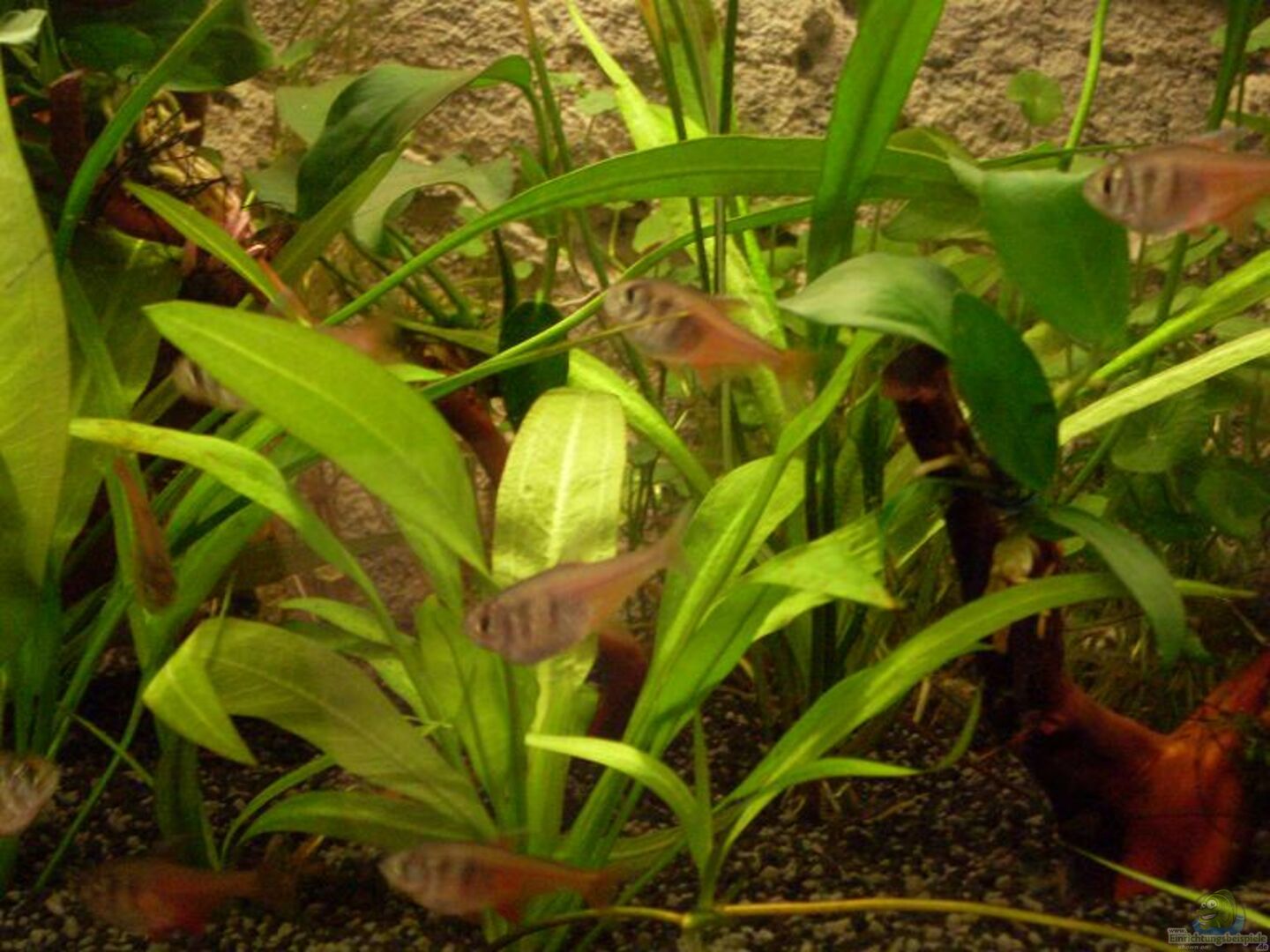 # Fische: * 16 Stück Roter von Rio ( Hyphessobrycon flammeus) * 10 Stück Gepunkteter Panzerwels (Corydoras punctatus) # Wirbellose: * 05 Stück Raubturmdeckelschnecke (Anentome helena) sind ins Becken meiner Freundin gezogen * 05 Stück Tribal-Rennschnecke (Neritina sp.)