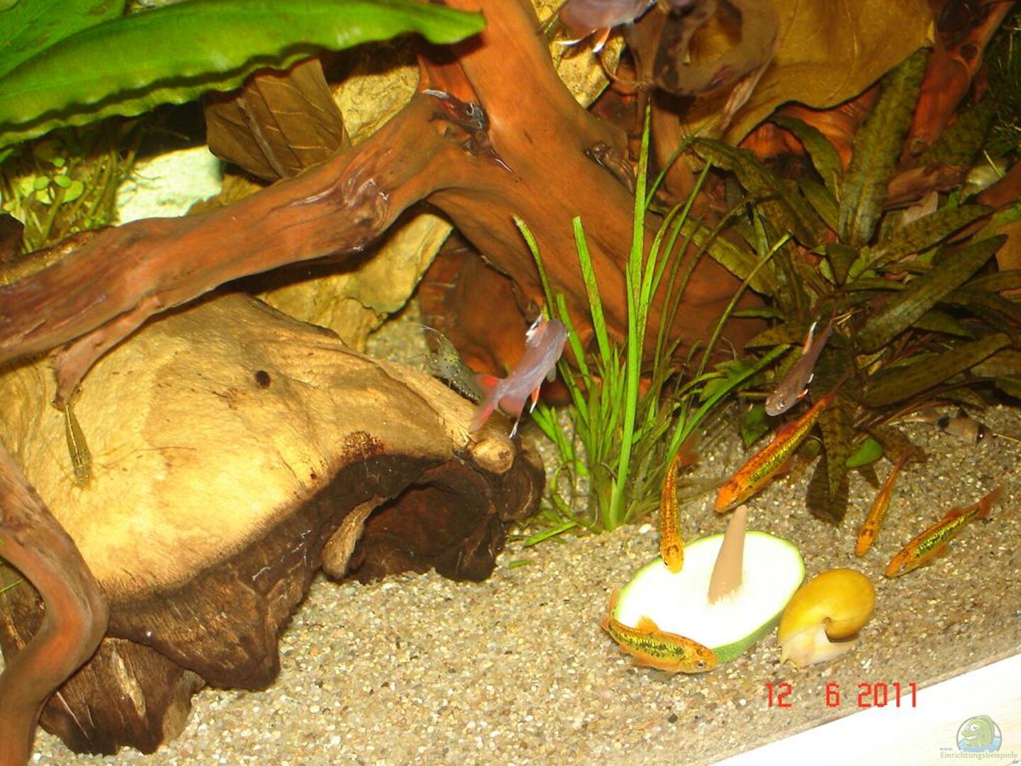 UPDATE - 16.07.2011 Am Besatz selber hat sich nichts geändert. Jedoch hierzu einige Erläuterungen: Durch mangelnde Informationsbeschaffung meinerseits, wurden bei meinem Erstbesatz sowohl Kalt- und Warmwasserfische angeschafft. Daher fahre beim Becken bzgl. der Temperatur zur Zeit einen Kompromiss - 26/27° C. Zur Zeit scheinen sie auch gut mit den gegebenheiten klar zu kommen...zumindest lässt dies ihr Verhalten ableiten (kein wenig Scheu, sehr aktiv, viel Appetit und keinerlei Anzeichen [...]