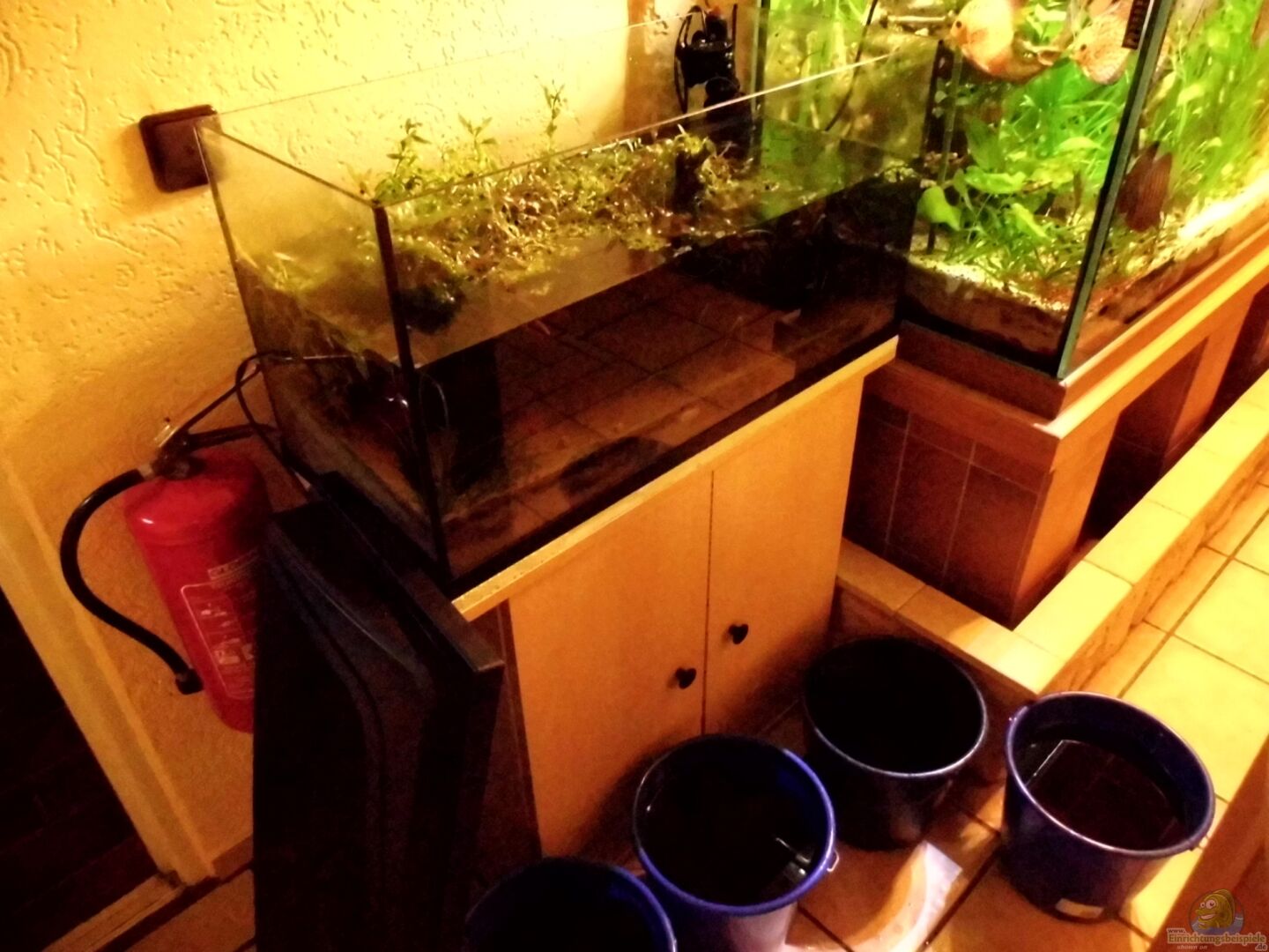 Zwischen Beckenboden und Schrank 20 Milimeter Styrodur .An den 2 Rückwänden wurden auch 20 Milimeter Styrodurplatten zur Wärmedämmung verwendet. Diese sind mit schwarzen Möbelrückwandplatten versehen. Das Becken wurde gebraucht erstanden ( E..y)leider war wie zu oft, hatte die Beschreibung wenig mit Wirklichkeit zutun. Da das Becken sehr viele und starke Kratzer ausweist, habe ich die schlimmsten Stellen im oberen und unteren Teil mit Knickband beklebt.( Bilder werden noch eingestellt)