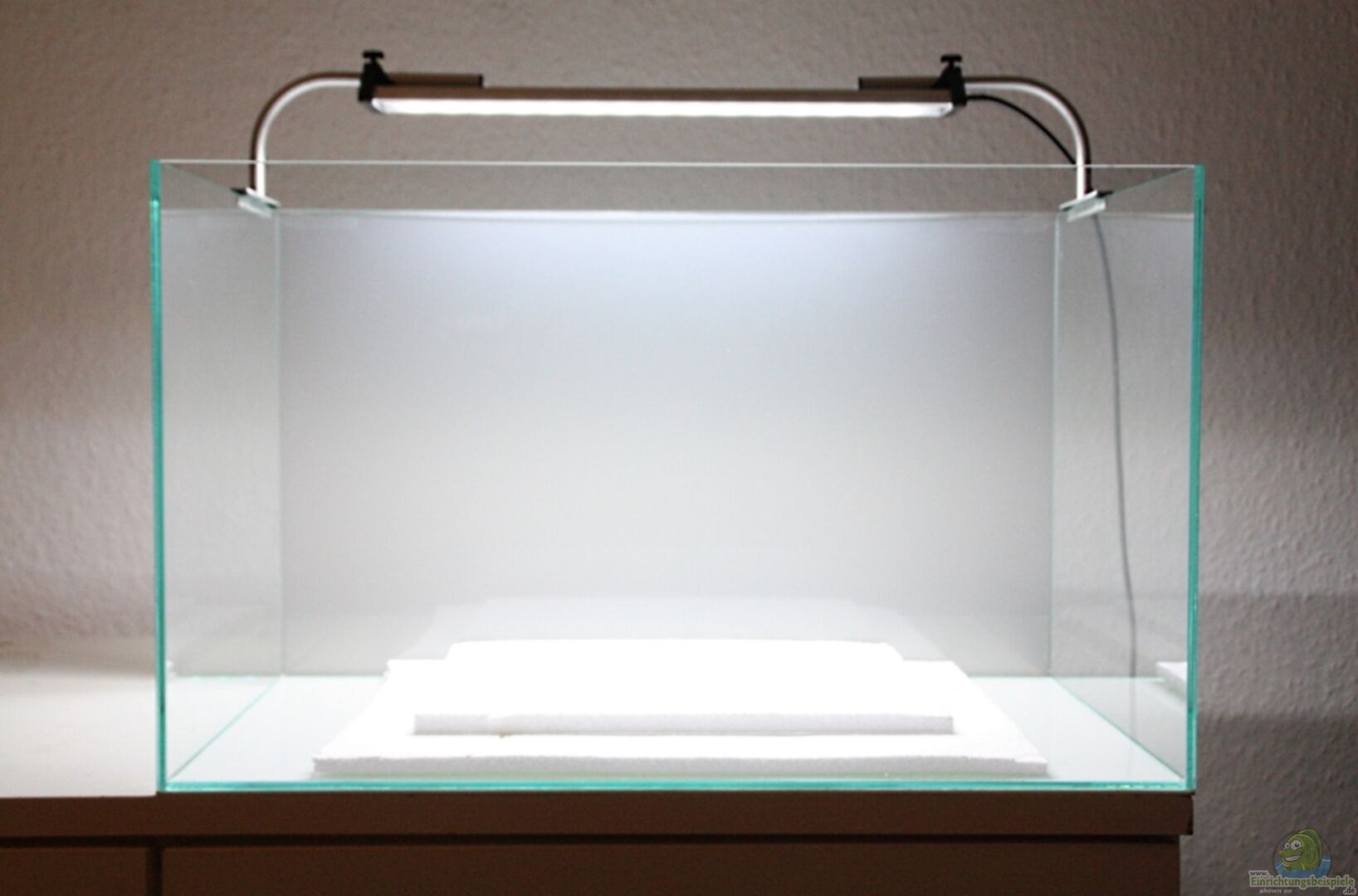 -ein sehr schönes, transparent verklebtes Poolaquarium (ohne Streben). Die Nähte sind nur hauchdünn verklebt. -Als Hintergrundfolie eine Milchglaslampenschirmfolie aus dem Bastelgeschäft. -Auf Empfehlung von Herrn Just hab ich statt Styropor nun eine wei??e Moosgummiplatte unter dem Becken. Hier gibt es eine detaillierte Fotostrecke zum Aufbau: