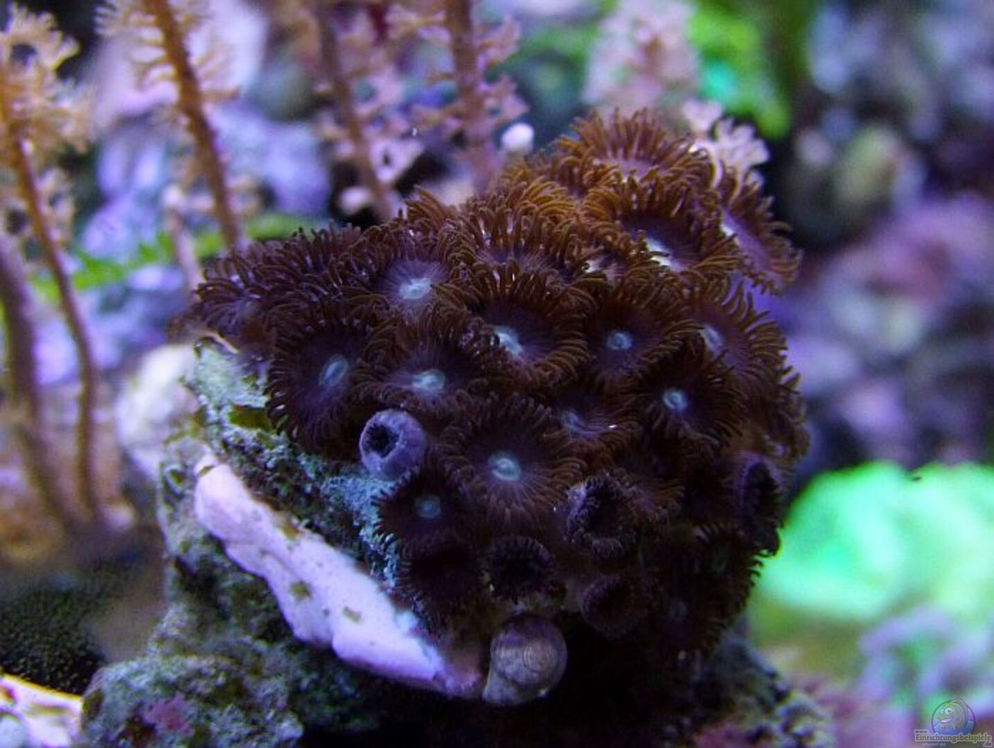 Korallen: * Zoanthus sp., unterschiedliche Färbungen. Erst nach dem zweiten Versuch klappte das Einbringen! Beim ersten mal wunderte ich mich, dass die Polypen nach und nach verschwanden... bis ich eine Heliacos-Schnecke absammelte und vor allem die dunkelgrauen Asterinas mehrfach beim gemütlichen Mampfen erwischte. Ich war mir nicht sicher, ob die kleinen Seesternchen nicht einfach nur die Gunst der Stunde nutzten und das Werk der Schnecke vollendeten- sprich, nur an bereits angeschlagenen Polypen [...]