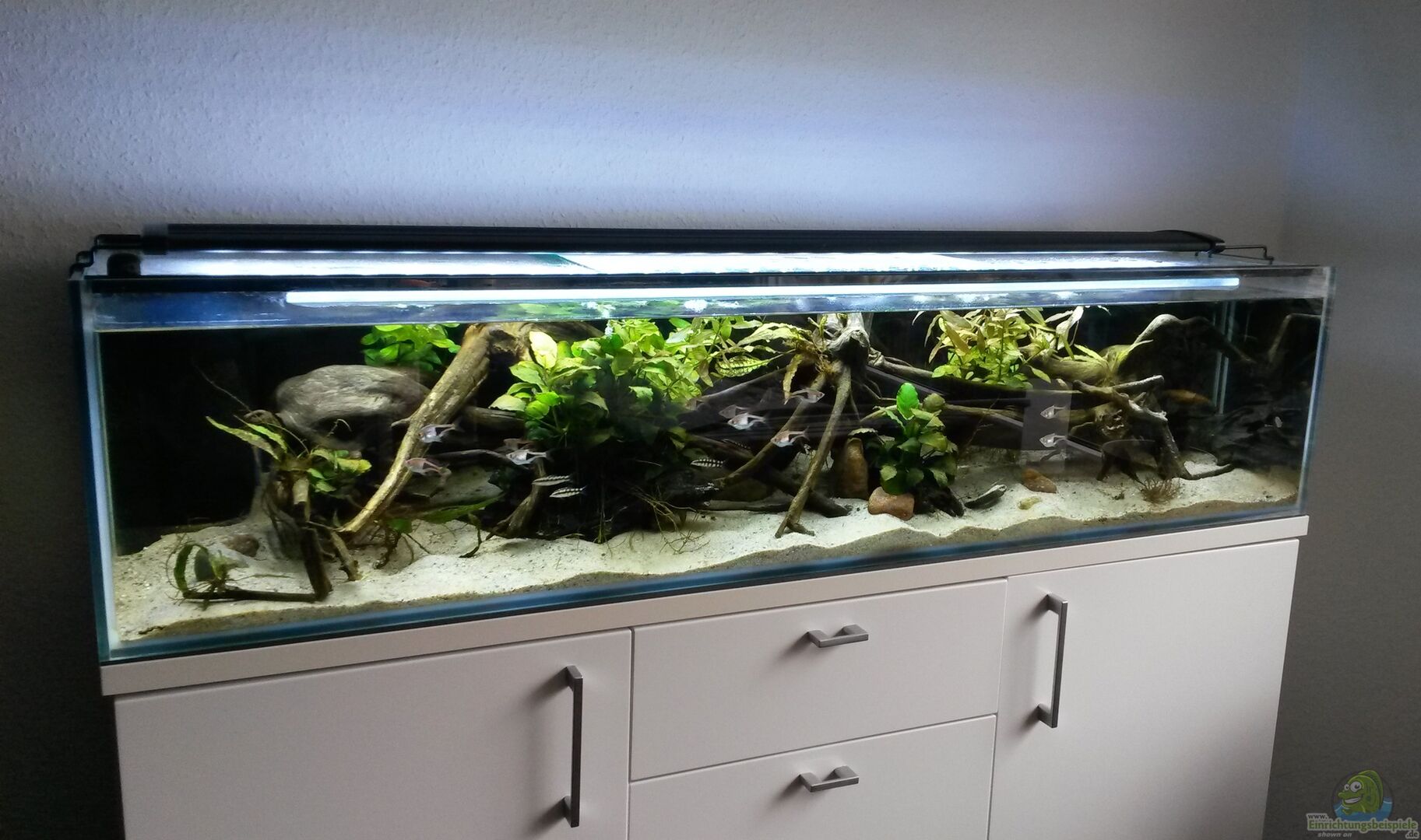 Wieder einmal handelt es sich bei dem Becken um eine Sonderanfertigung, die diesmal passend zum Sideboard gefertigt wurde. Hersteller ist die Firma Aquarienbau Voigt in Werneuchen bei Berlin. Das Becken wurde aus 8mm starkem Floatglas gefertigt und mit transparentem Silikon geklebt. Passgenau dazu habe ich mir eine dreiteilige Glasabdeckung von der Fa. Voigt anfertigen lassen, welche in zwei Kunststoff-E-Profilen auf der gesamten Beckenlänge verschiebbar ist. Als zusätzlichen Service wurden mir [...]