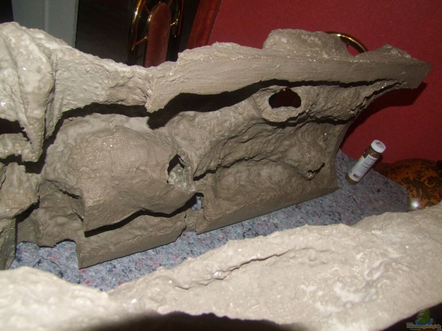 Hinterschwimmbare Rückwand aus Styropor 1, 20x0, 60x0, 14m, Eigenbau mit Höhleneingängen und Felsvorsprüngen. 10mm Styroporplatte zum Schutz der Bodenplatte. Steine für die Felsaufbauten
