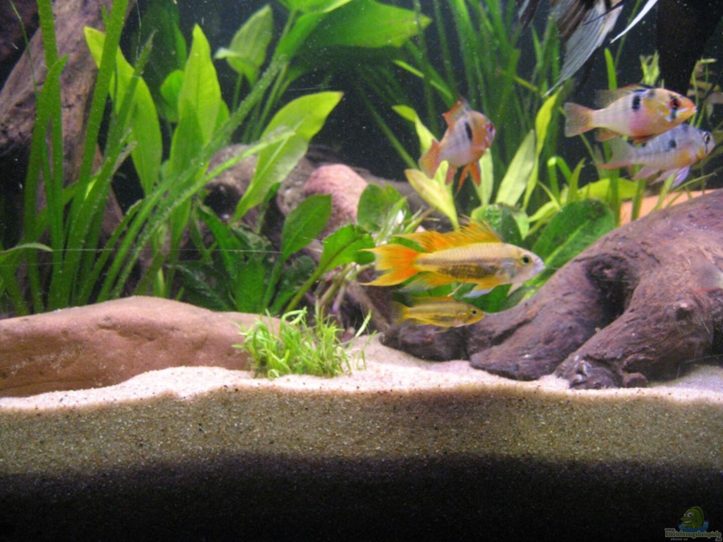 4x Pterophyllum scalare ´Koi´, beides Pärchen 2w/1m Apistogramma cacatuoides 1 w Apistogramma ramirezi 1 Paar Mikrogeoghagus altispinosus 10x Corydoras elegans 5x Corydoras cf. steindachneri ca.14x Otocinclus hoppei Die Zwerge verstehen sich wieder erwarten sehr gut, es gab bisher keinerlei Revierkämpfe o. ä.. Im Gegenteil, die 6 sind viel zusammen unterwegs.