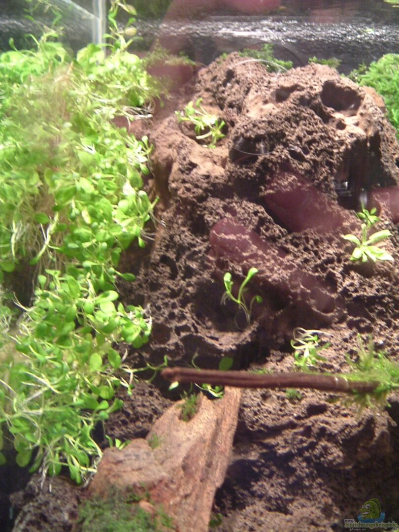 Versteinertes Holz, auf dem pellia aufgebunden ist Kleiner Lavabrocken auf dem das X-mas-Moos wächst. lavabrocken, die im ganzen becken auftreten und mit verschiedensten pflanzen bewachsen sind (riccia rhenana, Hemianthus callitrichoides Cuba, pogostemon helferi, glossostigma elastinoides, pella, süwassertang) einige blätter (buche und eiche), um häutungsprobleme vorzubeugen!