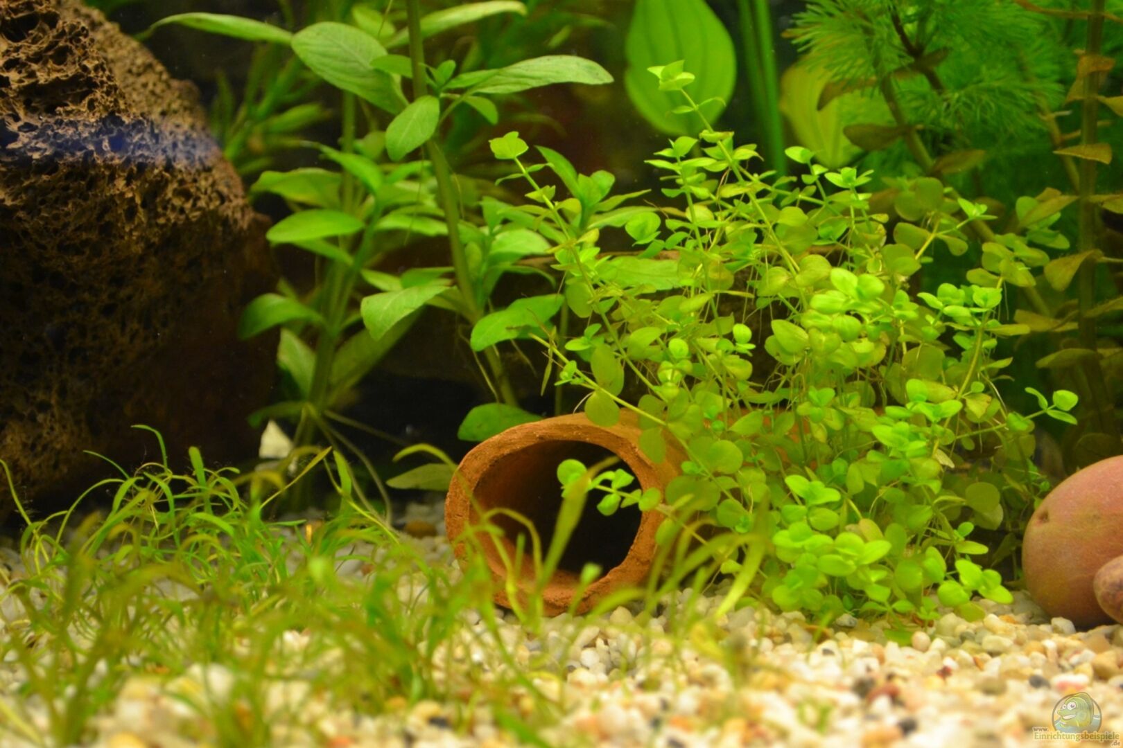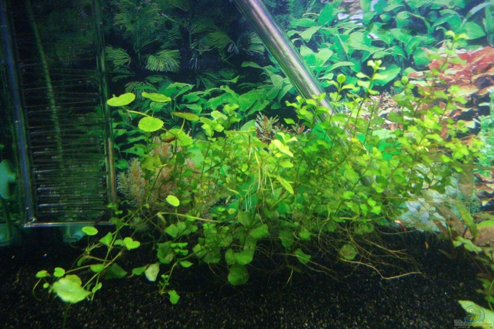 Vordergrund: Lilaeopsos brasiliensis; Neben der Röhre: Mic