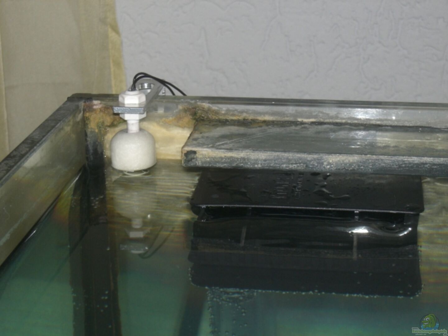 Innenfilter, durch eine Glasscheibe vom Becken getrennt. Dar