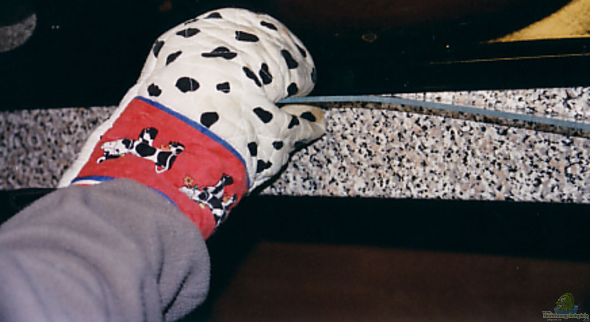 Mit Backhandschuh, damit man sich nicht die Finger verbrennt