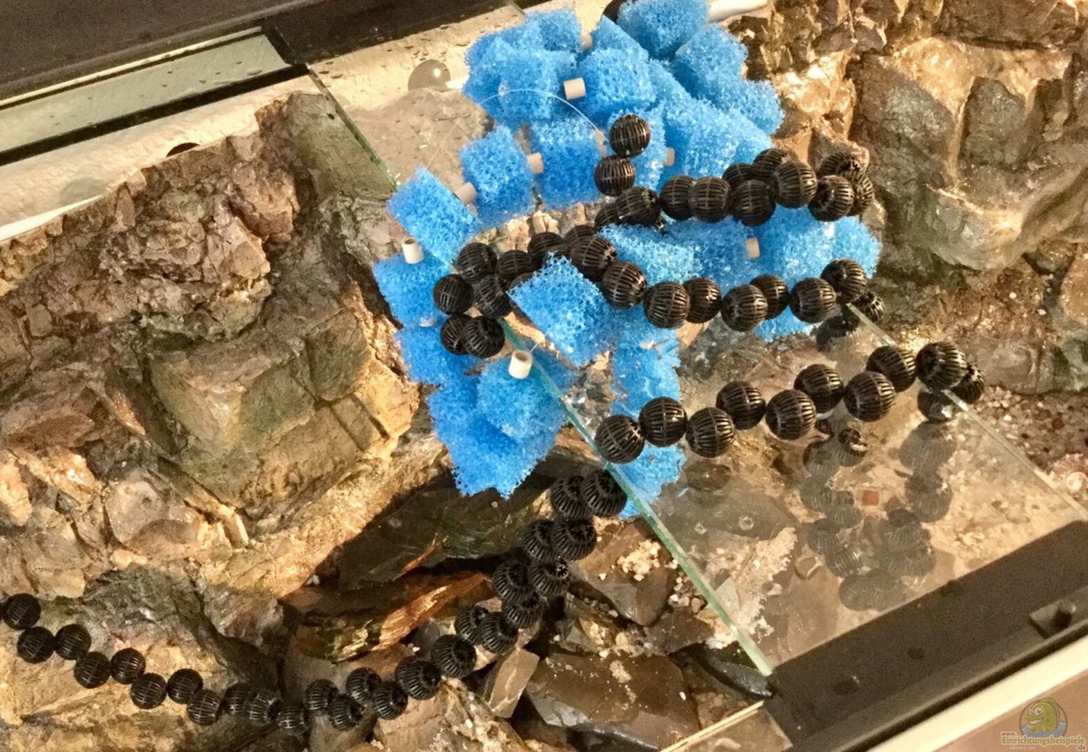 Bio-Filterbälle und Schaumstoff-Würfel, zu Perlketten aufg