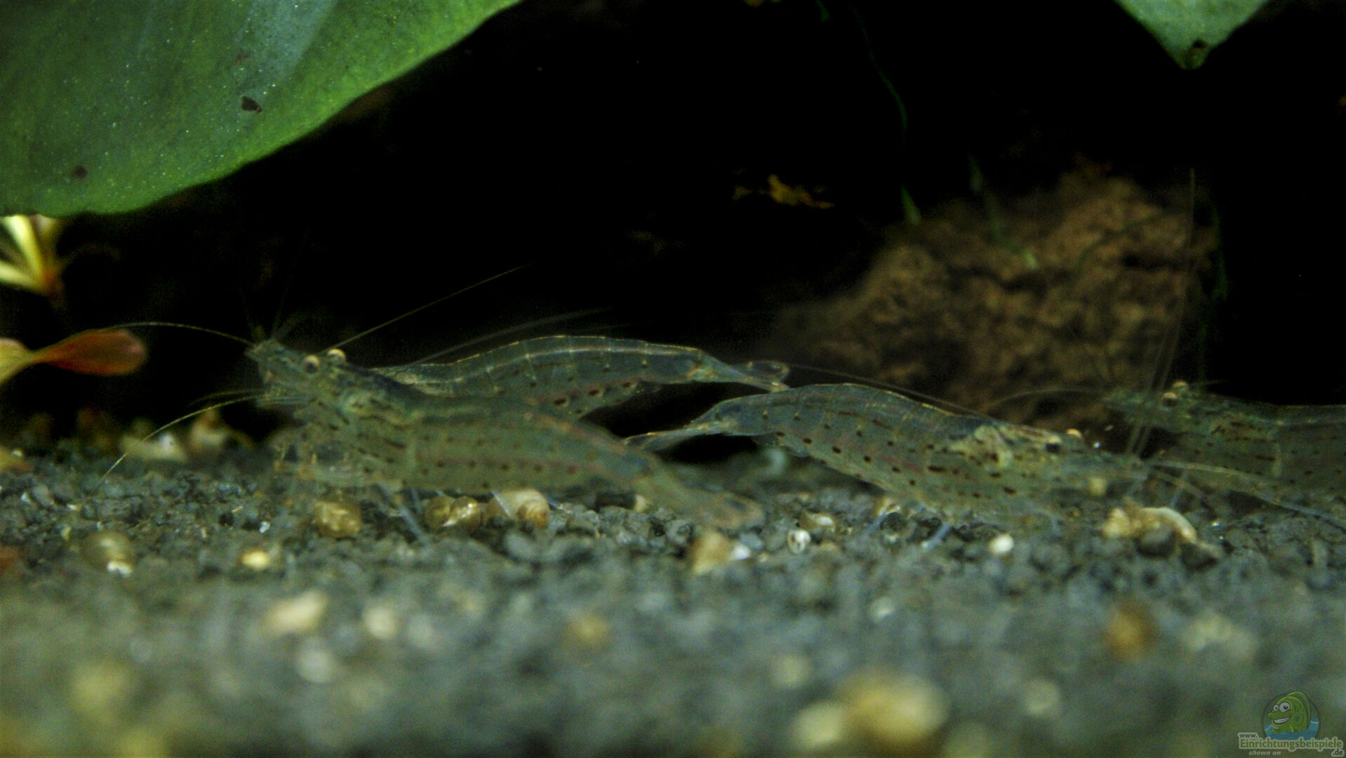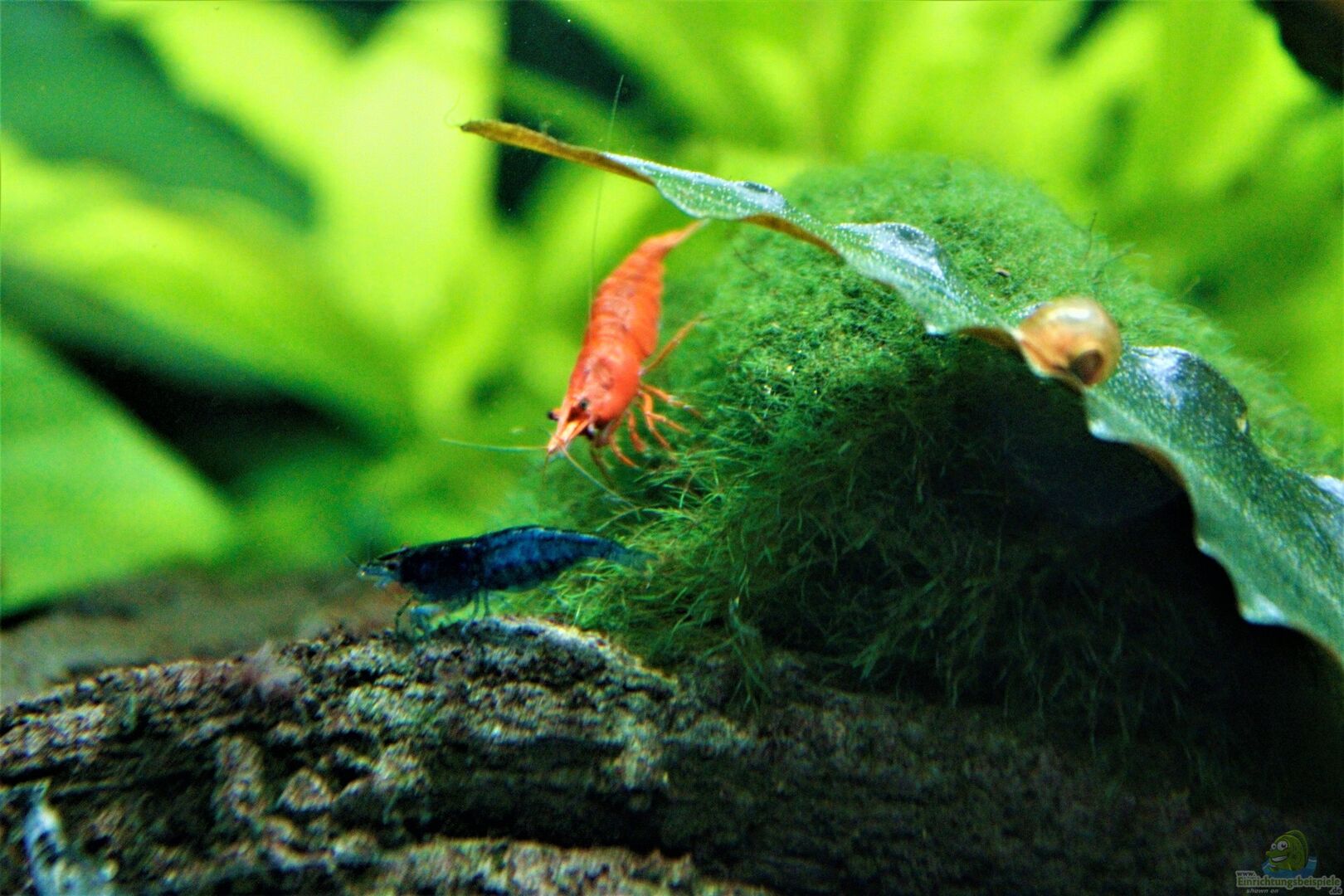 Orangener Zwergflusskrebs in der Mitte und Amanogarnele oben