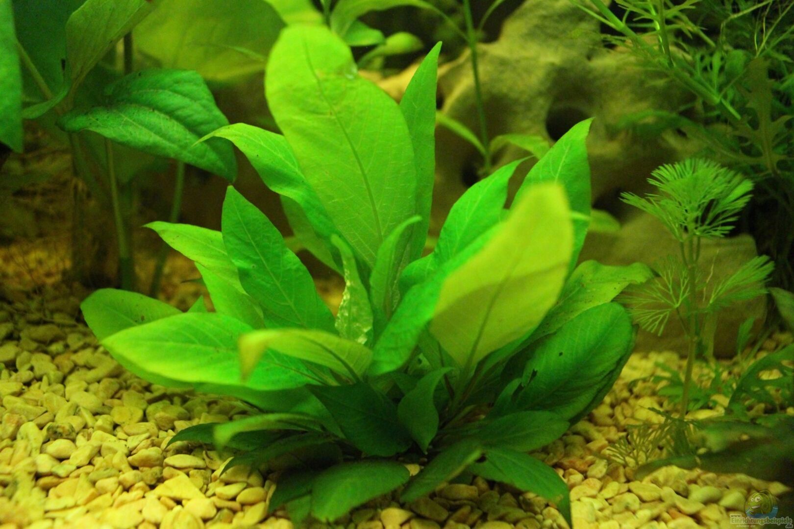Anubias barteri var. Nana Gold (dahinter Polster aus Flamm