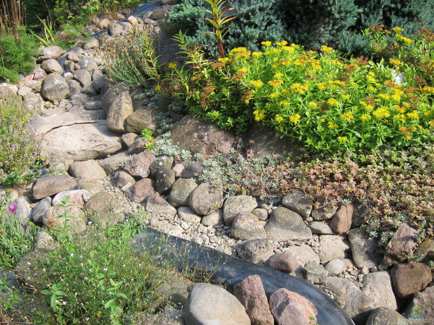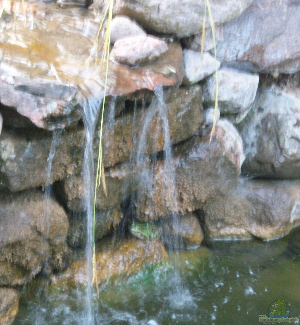 Der Bach verläuft durch einen Steingartenberg, der bis zum Wasserfall eine Höhe von ca. 1, 5 Meter hat. ??ber den Bach führt eine Treppe zur Terrasse; der Bach wird darunter durch ein Rohr geleitet.