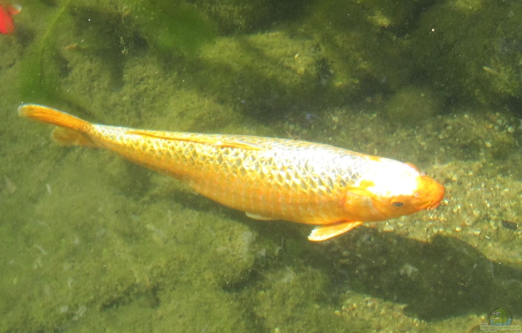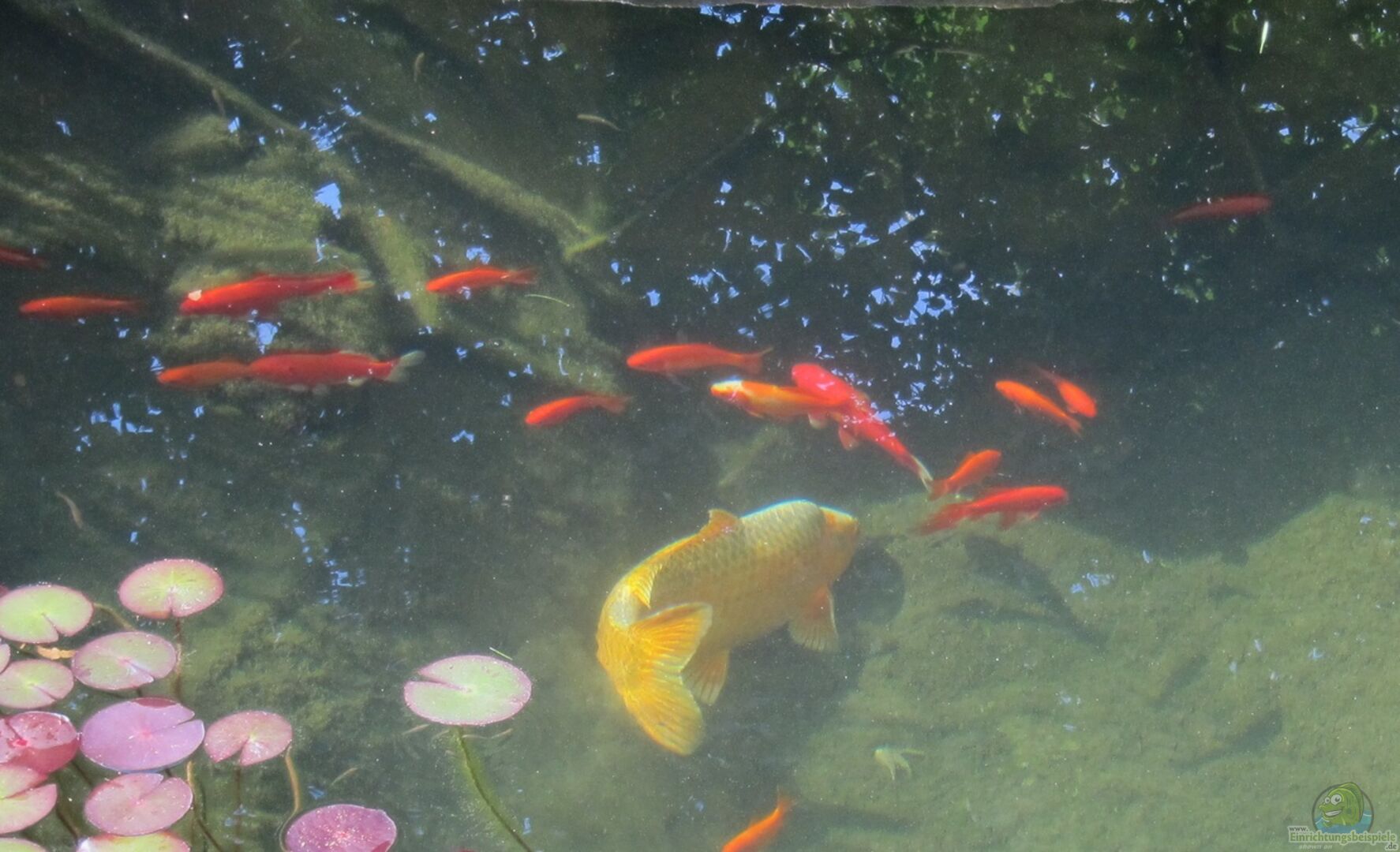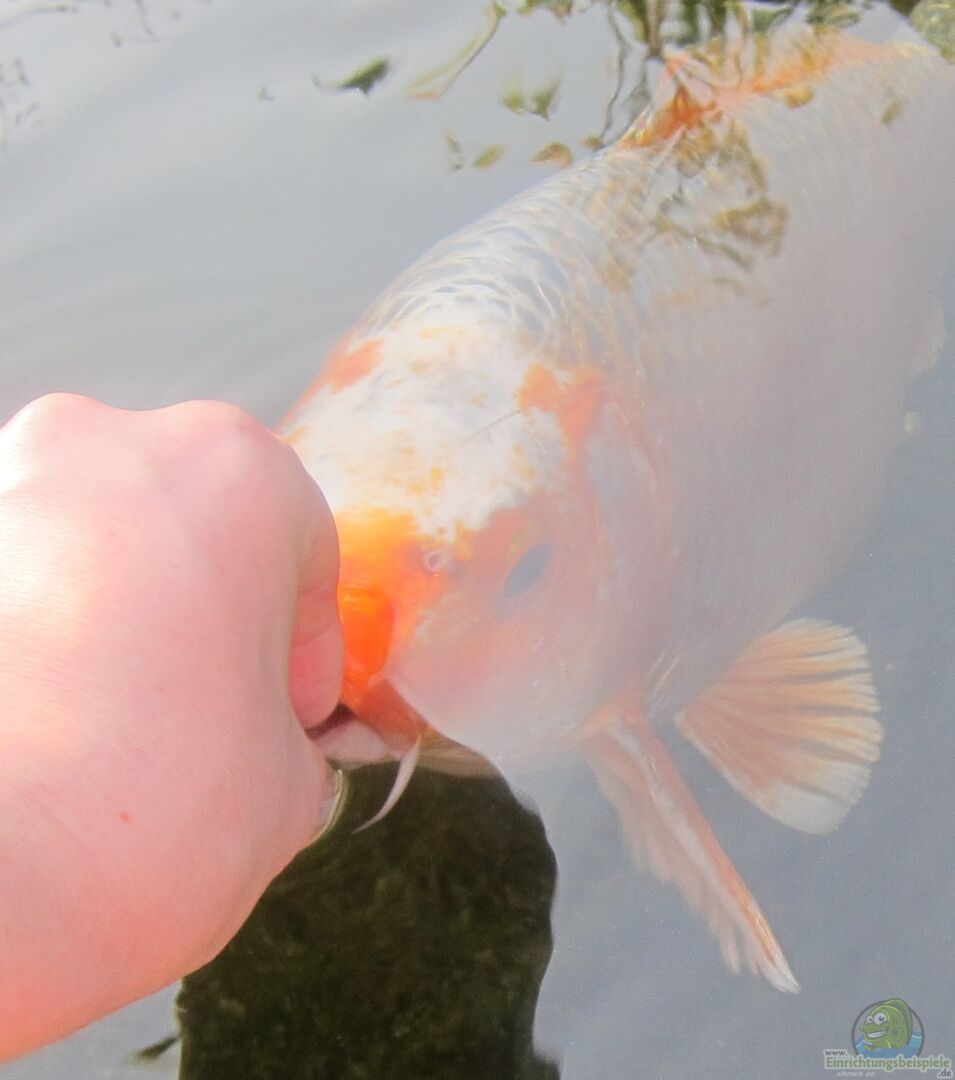 Der Koi bekommt regelmä??ig Koifutterpellets, manchmal getrocknete Bachflohkrebse oder Seidenraupenlarven.