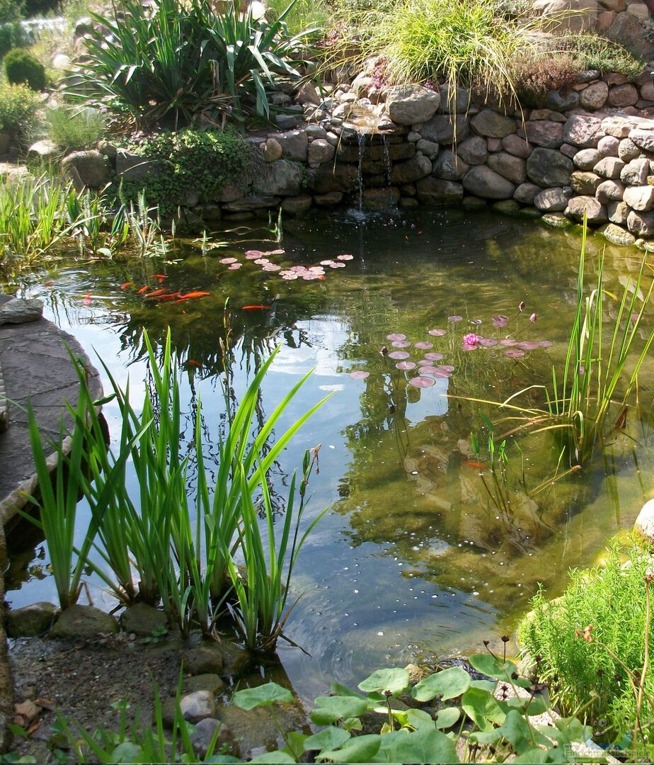 Der Teich wird stufenartig tiefer. Es gibt 4 Tiefenstufen. Der tiefste Bereich ist vorne mittig. Der Teich wird von 2 Seiten von einer Feldsteinmauer begrenzt, an den anderen beiden Seiten grenzt er an Rasenfläche.