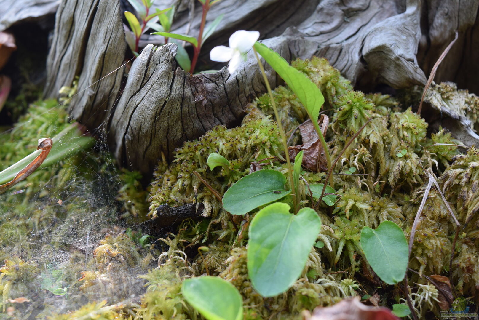 Der Rand ist mit Korkrindenstücken abgedeckt, um die Folie zu verstecken. Ein schöne alte Aquarienwurzeln dient der Gestaltung.