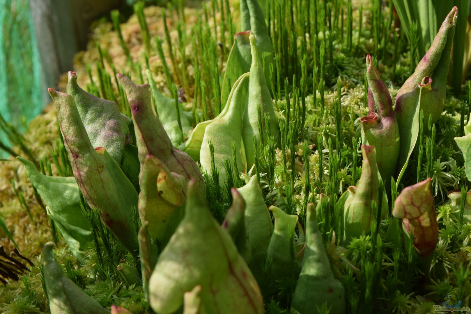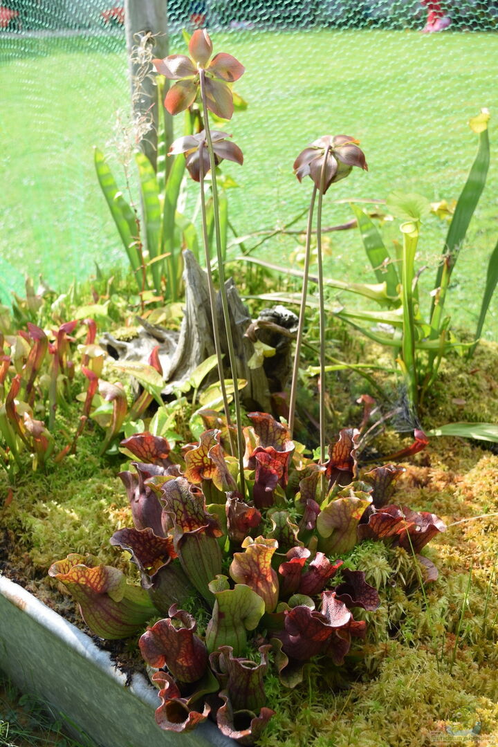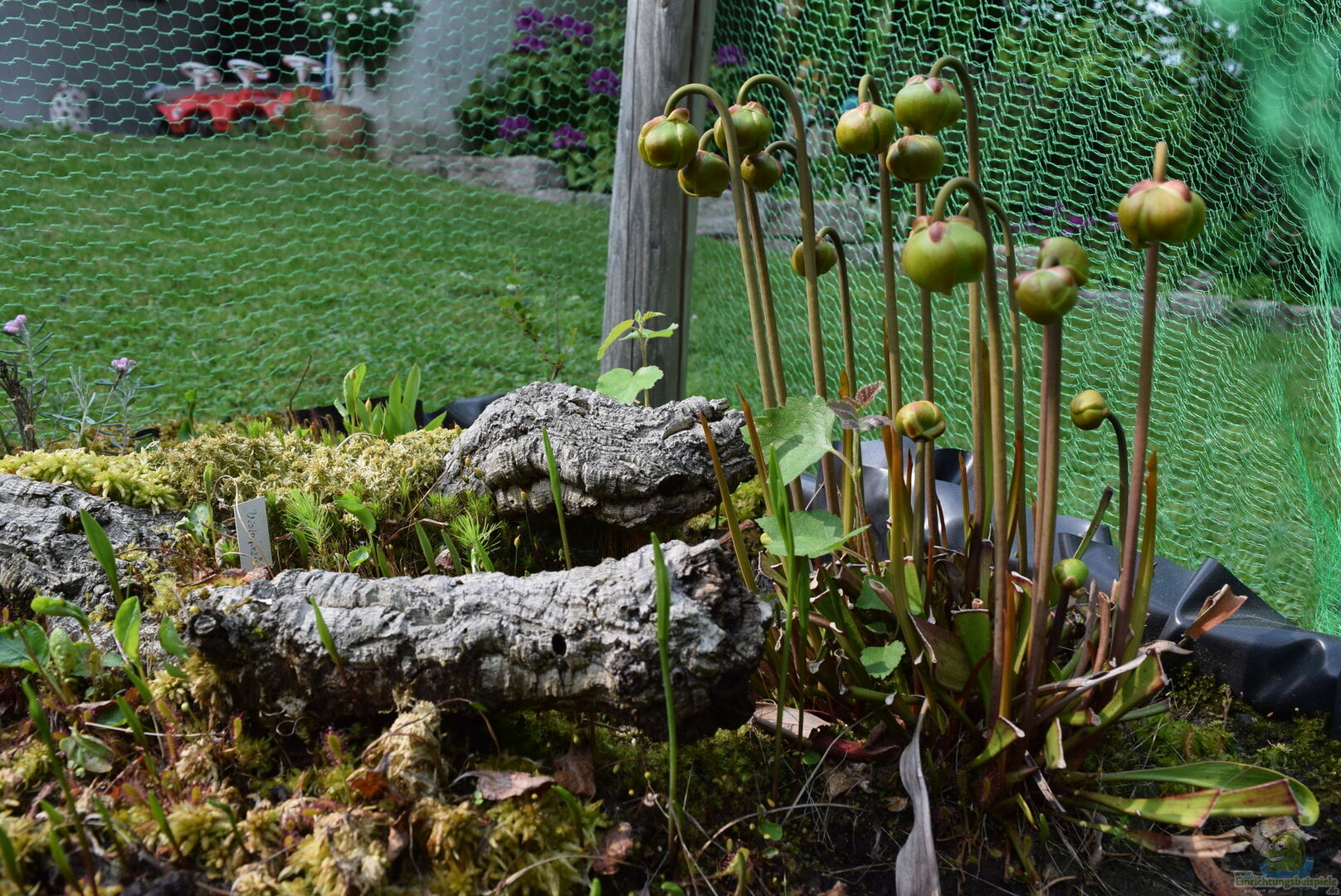 Weiterhin war ein Netzgerüst notwendig, um Amseln davor abzuhalten, dass eingesetzte Sphagnum-Moos und die randvoll mit Insekten gefüllten Kannenpflanzen, zu plündern.