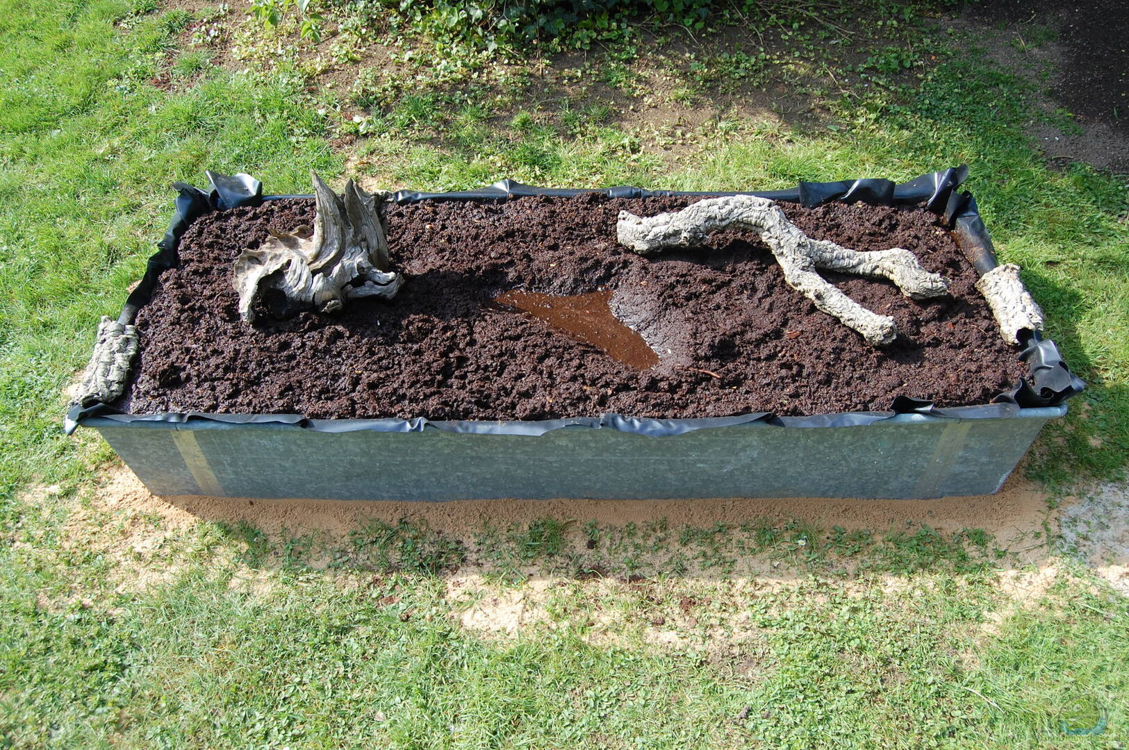 Das Grundgerüst besteht aus einer verzinkten Blechwanne, welche ich zusätzlich mit einer EPDM-Folie ausgekleidet hab und zur Hälfte eingegraben ist.