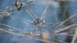 als wenn er gewartet hat, der erste Grasfrosch ist am Teich,