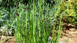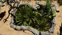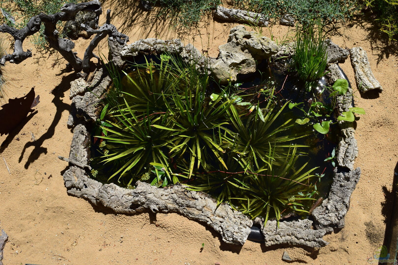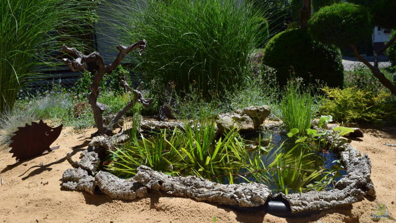 Der Teichrand ist mit Rindenstücken abgedeckt. Der Teich befindet sich in einem Sandbeet mit typischer Bepflanzung