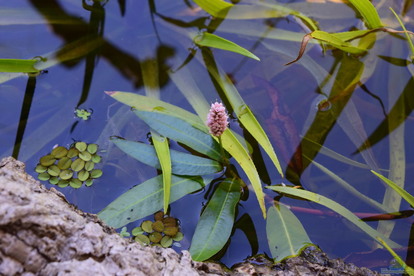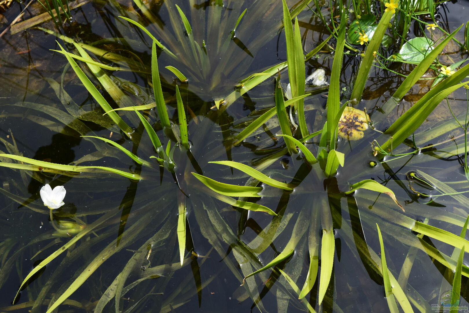 Butomus umbellatus (Blumenbinse), Ranunculus flammula (Brennender Hahnenfuss), Caltha palustris (Dotterblume), Juncus ensifolius (Zwerg-Binse), Stratiodes aloides (Krebsschere), die frei im Wasser schwimmt, Hydrocharis morsus-ranae (Froschbiss), Potamogeton natans (Schwimmendes laichkraut), Salvinia natans