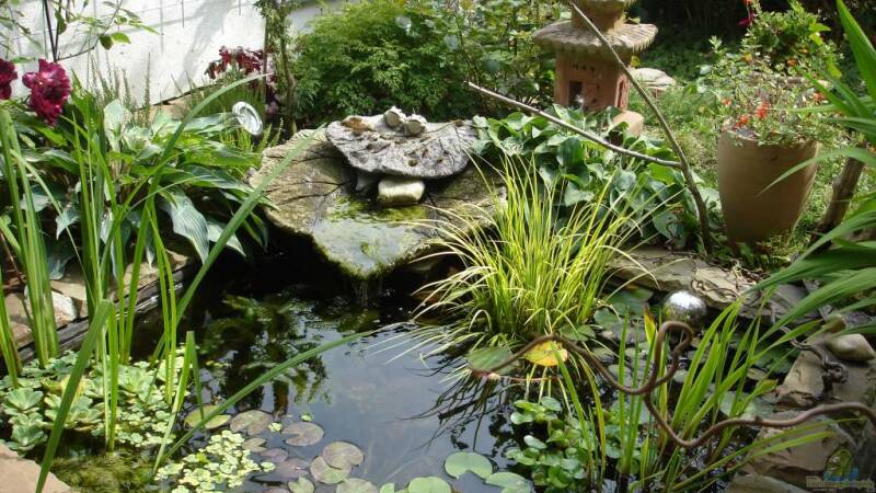 Aufgefüllt wird der Teich mit Aquarienwasser, wenn Wasser verdunstet ist.