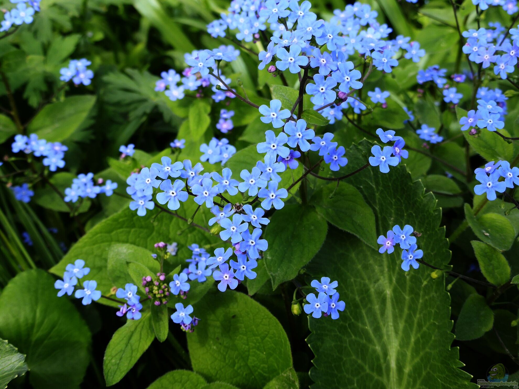 Die zarten, himmelblauen Blüten erscheinen von April bis Juni und ähneln optisch stark dem Vergissmeinnicht. Sie stehen in lockeren Rispen über dem Laub und bilden einen reizvollen Kontrast zum kräftigen Grün der Blätter. Einige Sorten haben auch leicht violett oder weiß gefärbte Blüten.