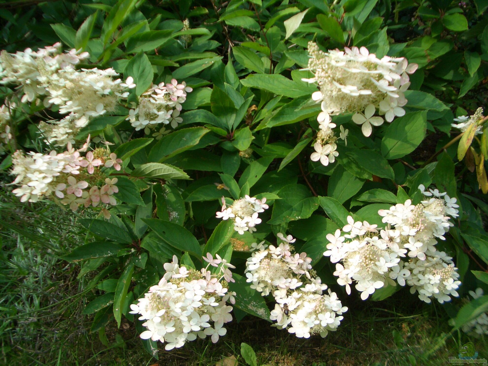 - Hydrangea paniculata ´Grandiflora´: Sehr große weiße Blütenrispen, die im Spätsommer rötliche Farbtöne annehmen.