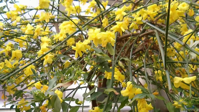 Die leuchtend gelben Blüten des Jasminum mesnyi erscheinen in den Winter- bis Frühlingsmonaten, meist von Februar bis April. Sie sind 3 bis 5 cm breit und duften leicht, was sie zu einem wahren Hingucker und Duftspender im Garten macht.