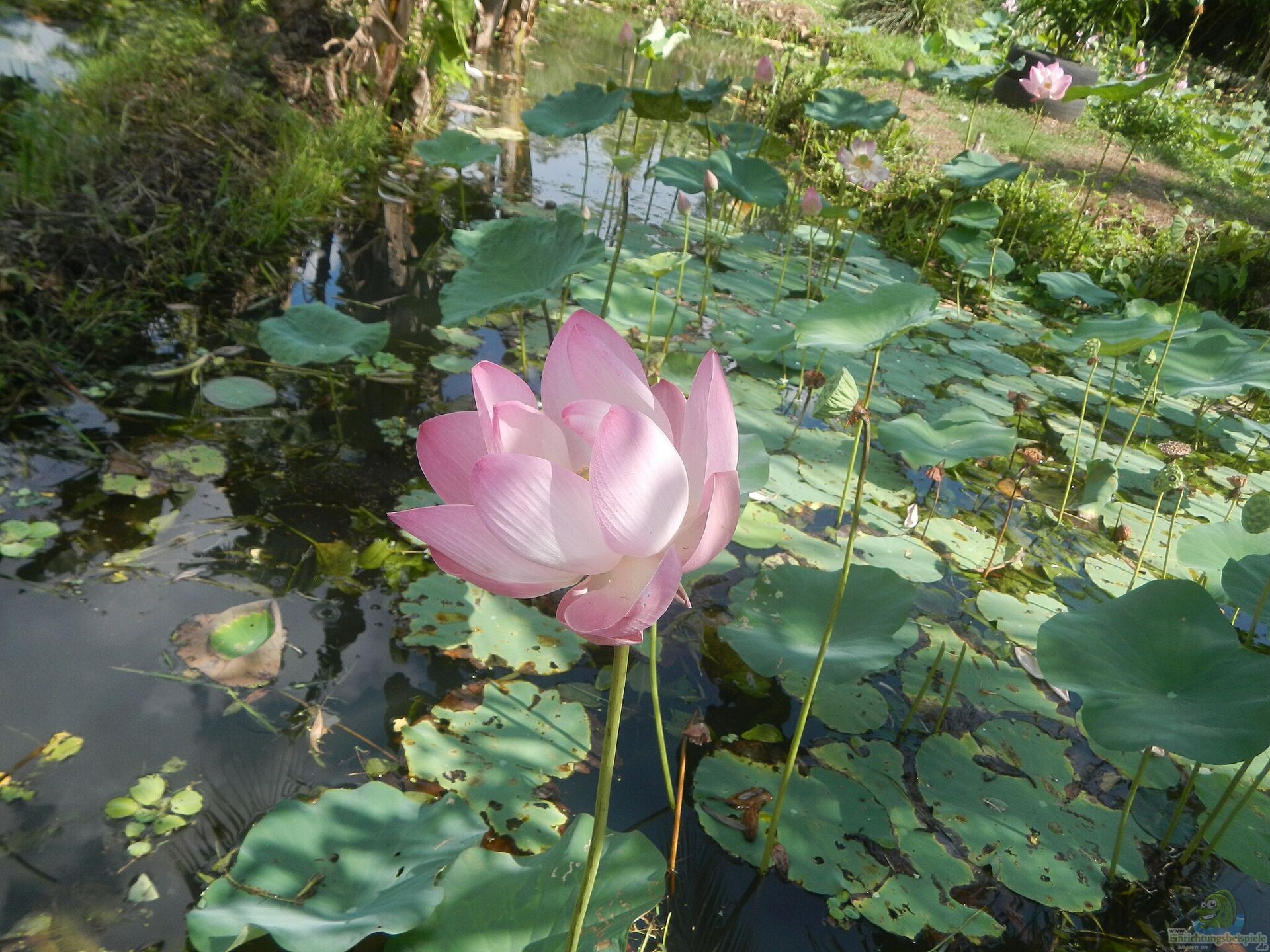 - Wasser: Lotusblumen sind Wasserpflanzen, daher sollten sie in einem Teich oder einem Behälter mit stehendem Wasser gepflanzt werden. Der Wasserstand sollte etwa 30 bis 60 cm über den Wurzeln der Pflanze liegen.