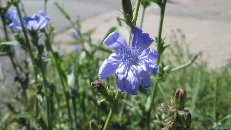 Die Wegwarte (Cichorium intybus) ist eine bemerkenswerte Pflanze für den naturnahen Garten, die durch ihre leuchtend blauen Blüten besticht und gleichzeitig pflegeleicht ist. Sie eignet sich ideal für sonnige, durchlässige Standorte und kann durch ihre Widerstandsfähigkeit, Essbarkeit und ökologische Bedeutung punkten. Am Rand eines Gartenteichs gepflanzt, bereichert sie den Lebensraum von Insekten und bringt ein Stück Wildblumenflair in deinen Garten.